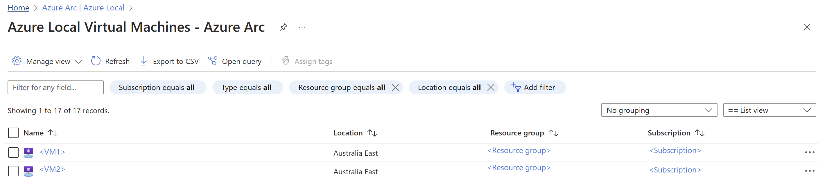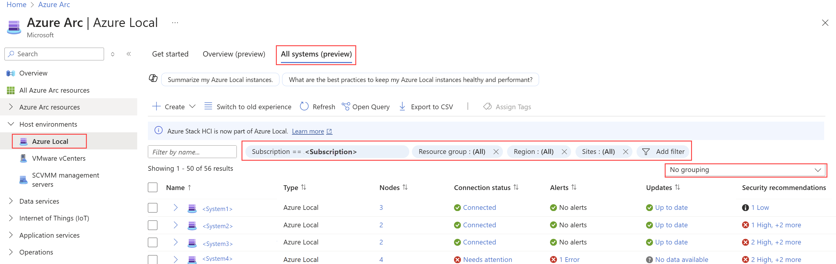 Dans le portail Azure, accédez auxenvironnements> hôtes Azure Arc>azure Local>Tous les systèmes. La page Tous les systèmes présente une vue hiérarchique de toutes vos charges de travail au sein d’un système.