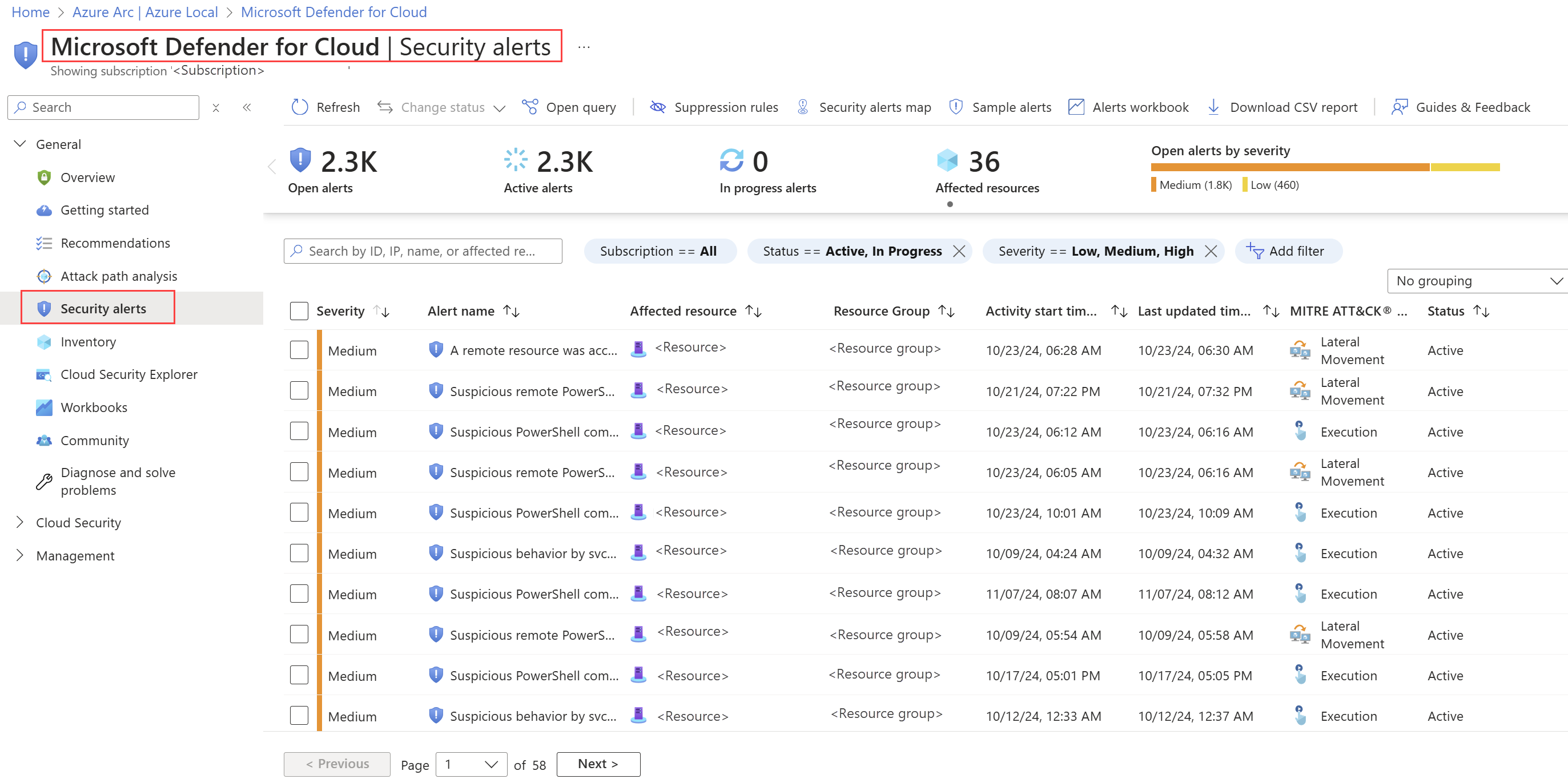 Vous pouvez filtrer l’affichage du tableau de bord par abonnement, groupe de ressources, région et sites.