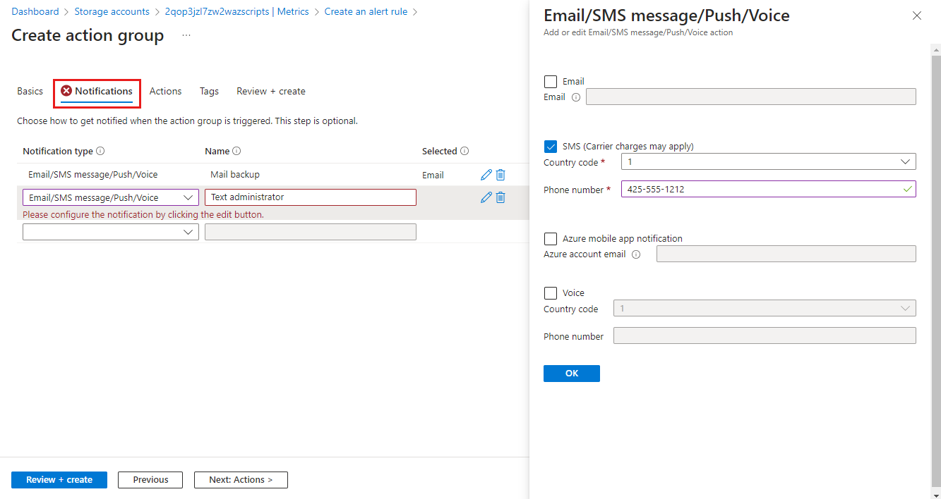 Sélectionnez un Abonnement et un Groupe de ressources pour le groupe d’actions. Ensuite, donnez-lui un Nom de groupe d'actions qui s’affichera sur le portail et un Nom d'affichage qui apparaîtra dans les notifications par e-mail et par SMS.