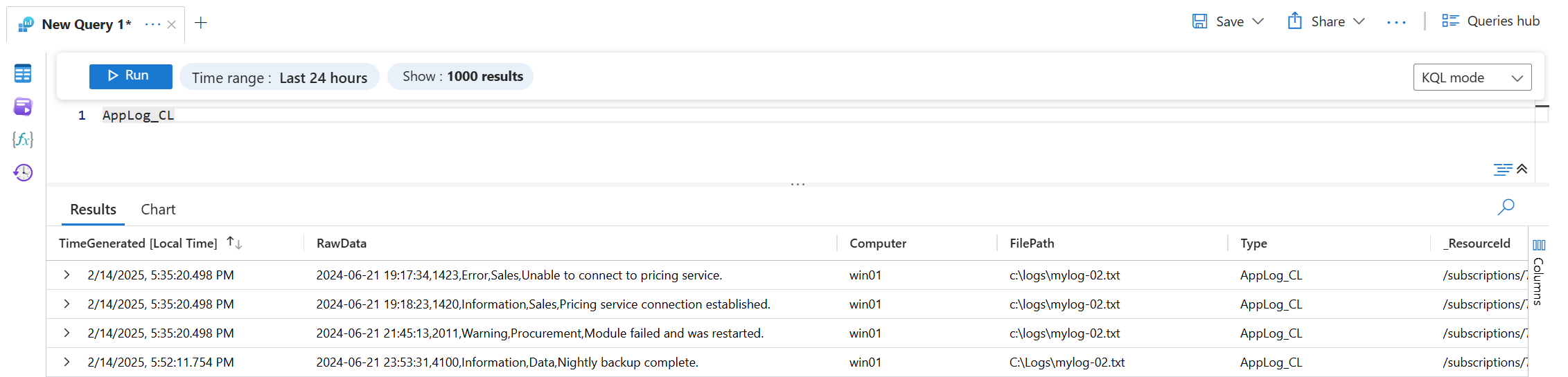 source | project d = split(RawData,",") | project TimeGenerated=todatetime(d[0]), Code=toint(d[1]), Severity=tostring(d[2]), Module=tostring(d[3]), Message=tostring(d[4])