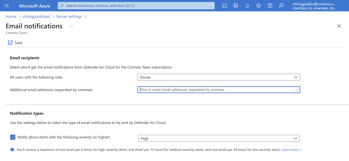Dans PARAMÈTRES ADVANCED THREAT PROTECTION, sélectionnez Ajouter vos coordonnées aux paramètres de messagerie de l’abonnement Defender pour le cloud.