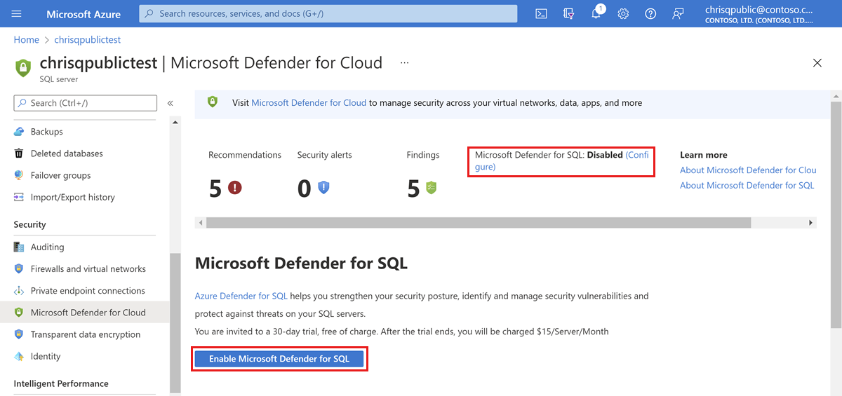 Accédez à la page de configuration du serveur logique Azure SQL Database que vous souhaitez protéger. Sous Paramètres de sécurité , sélectionnez Microsoft Defender pour cloud.