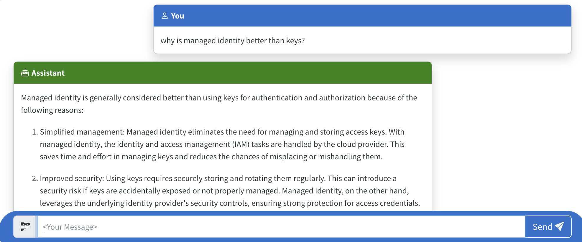 Deploying service webpour ouvrir l’application de conversation dans un navigateur.Dans le navigateur, entrez une question telle que « Pourquoi l’identité managée est-elle mieux que les clés ? ».