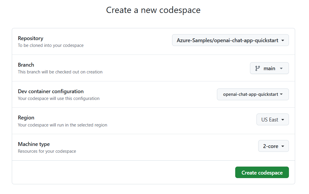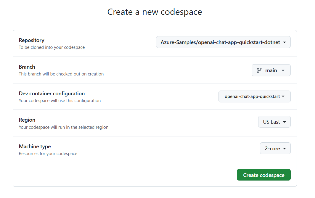 Procédez comme suit pour créer un espace de code GitHub sur la main branche du Azure-Samples/openai-chat-app-quickstart-dotnet dépôt GitHub.