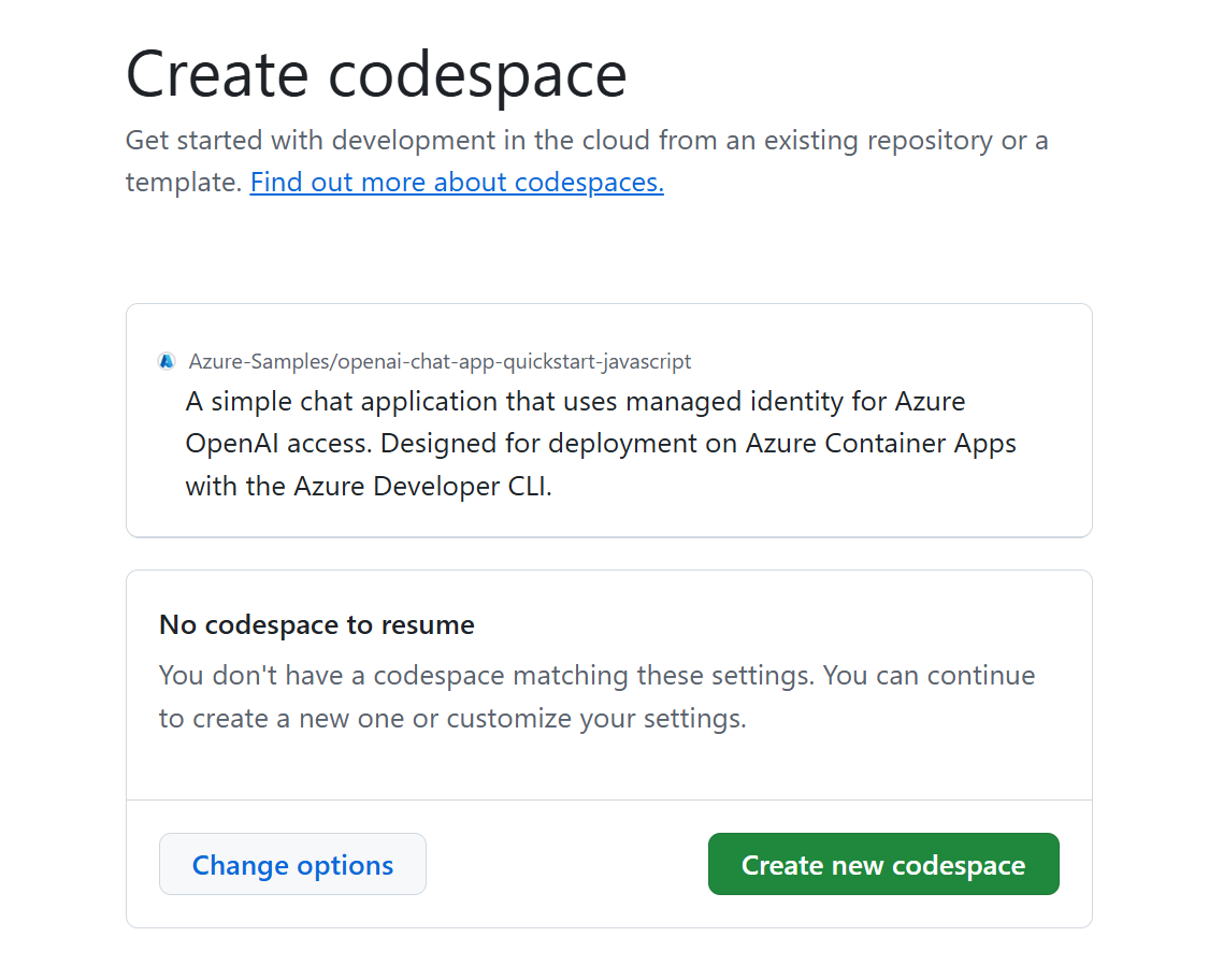 Procédez comme suit pour créer un espace de code GitHub sur la main branche du Azure-Samples/openai-chat-app-quickstart-javascript dépôt GitHub.