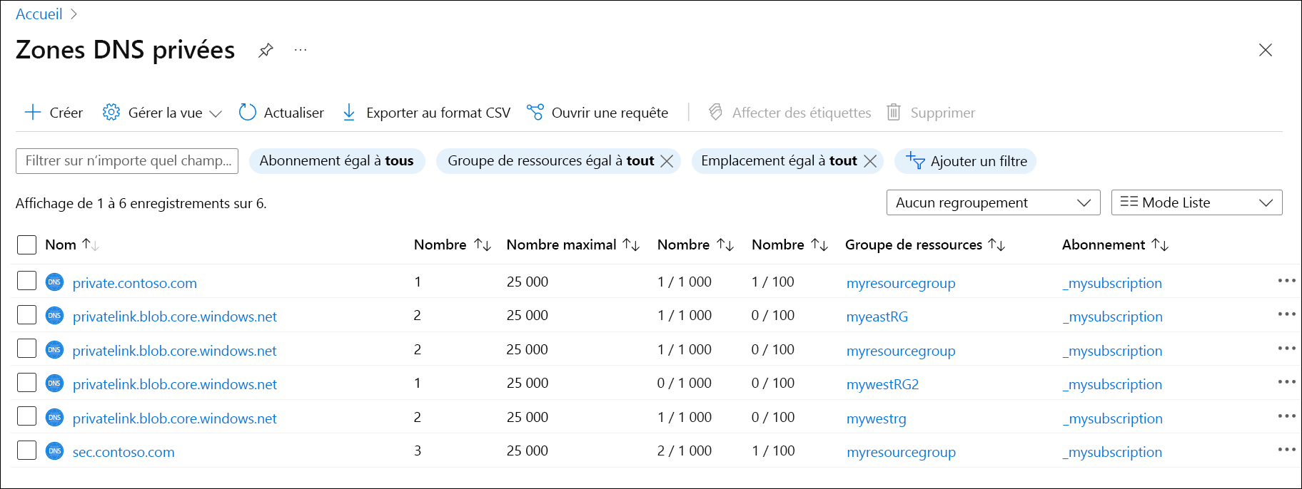 Passez en revue la liste des noms et vérifiez qu’au moins deux zones de DNS privé ont le même nom (privatelink.blob.core.windows.net). Voir l’exemple suivant :
