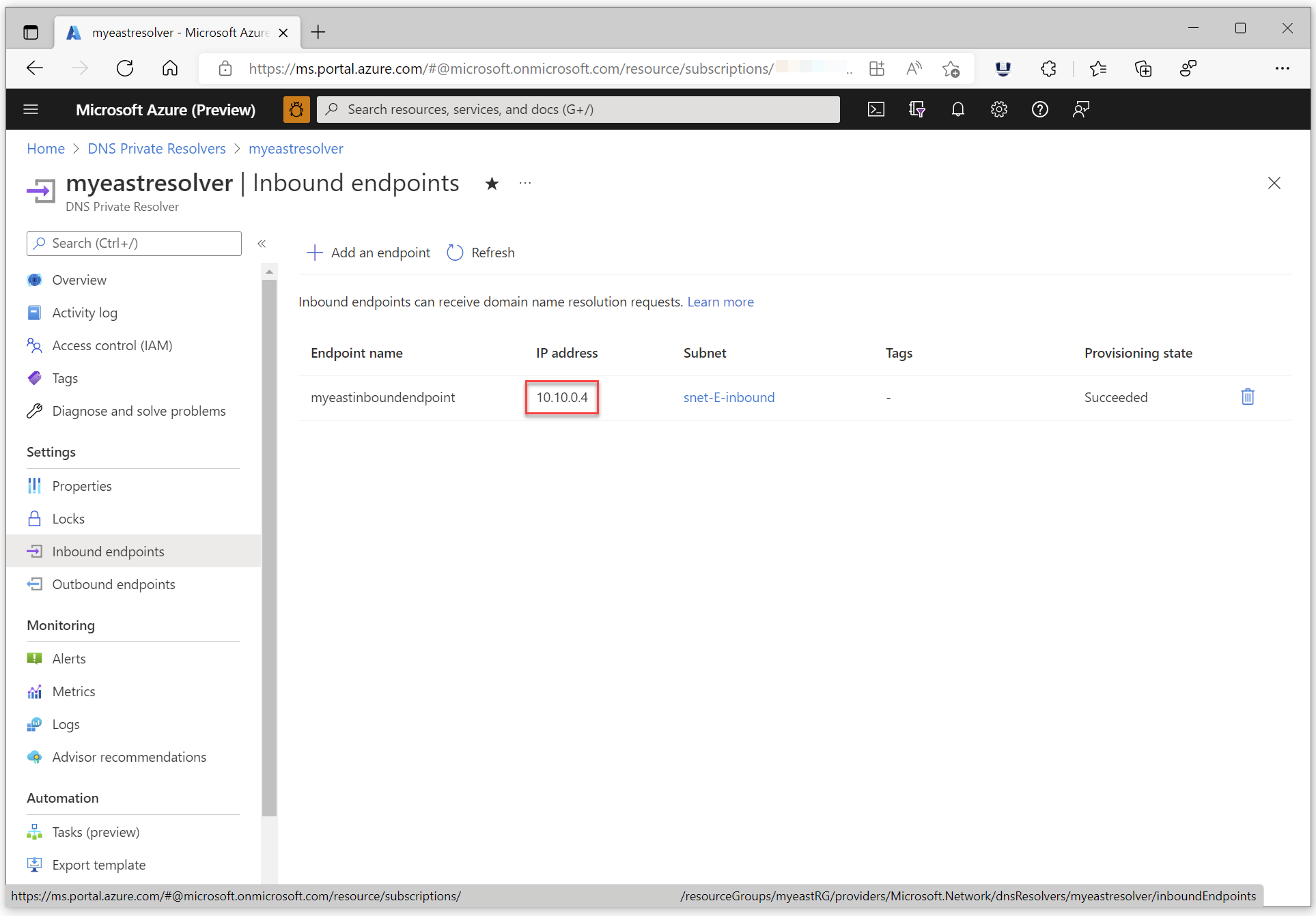Une fois terminé, notez l’adresse IP du point de terminaison entrant pour le service Azure DNS Private Resolver. Dans cet exemple, l’adresse IP est 10.10.0.4. Cette adresse IP sera utilisée ultérieurement pour configurer les redirecteurs conditionnels DNS locaux.