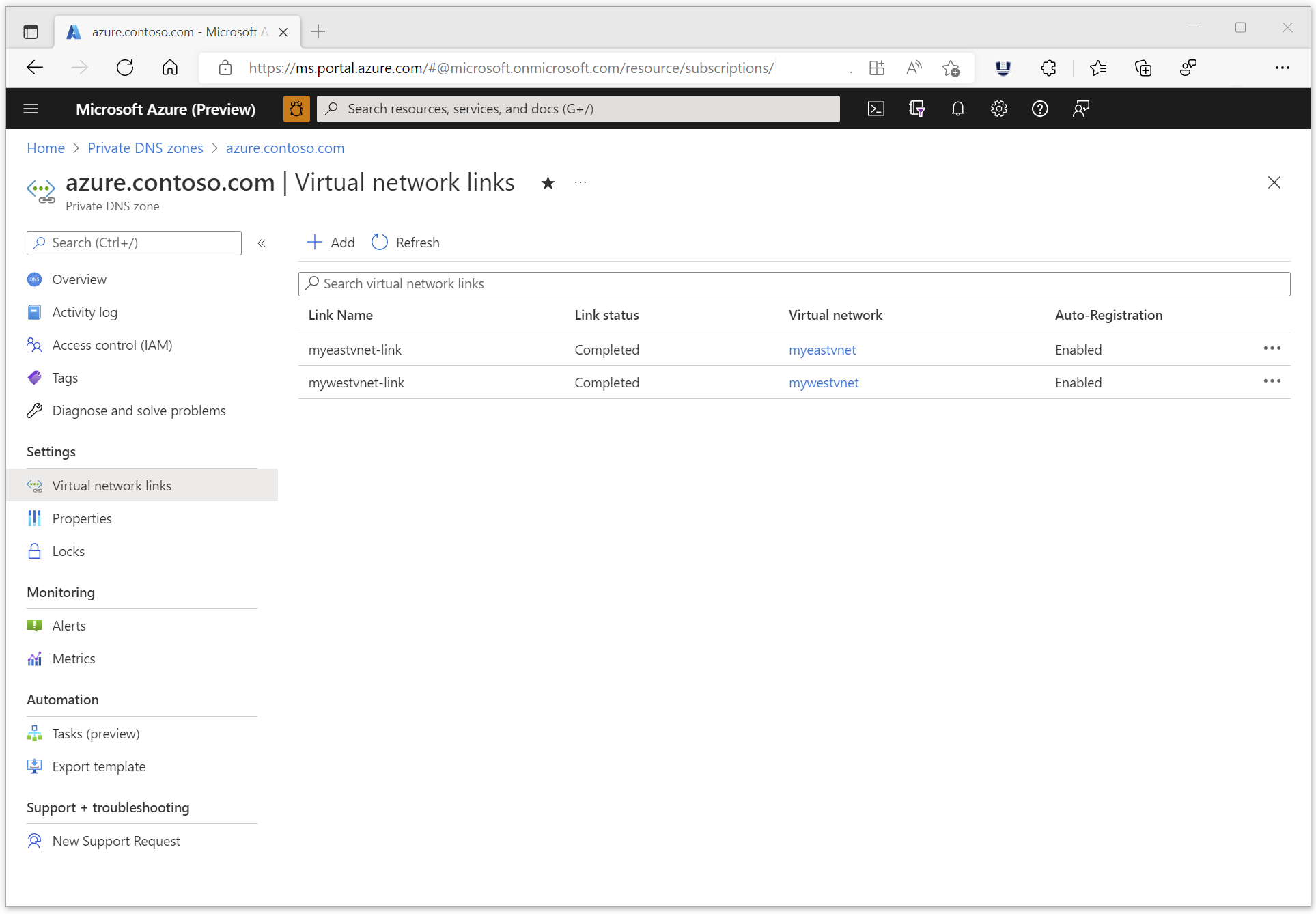 Dans cet article, la zone privée azure.contoso.com et l’enregistrement de ressource test sont utilisés. L’inscription automatique n’est pas requise pour la démonstration actuelle.