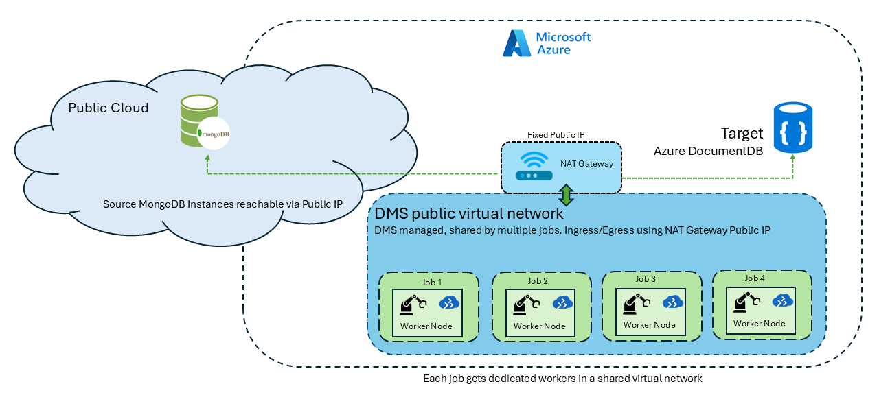 En mode de connectivité publique, le Azure Database Migration Service (DMS) se connecte à vos serveurs source et cible via l’Internet public. DMS fournit des adresses IP statiques que vous ajoutez aux listes d'autorisation du pare-feu sur les serveurs sources et cibles. DMS utilise un réseau virtuel public partagé pour toutes les migrations au sein d’une région donnée. Bien que ce réseau virtuel soit partagé entre les clients, chaque tâche de migration s’exécute sur son propre nœud worker privé isolé pour garantir l’isolation au niveau de la tâche.