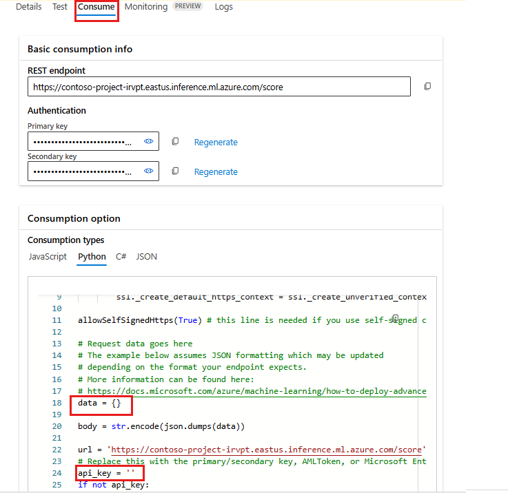Dans la page détails du déploiement, sélectionnez l’onglet Consommer . Vous pouvez trouver le point de terminaison REST et la clé/jeton pour consommer votre point de terminaison. Un exemple de code est également disponible pour vous permettre d'utiliser l'endpoint dans différentes langues.