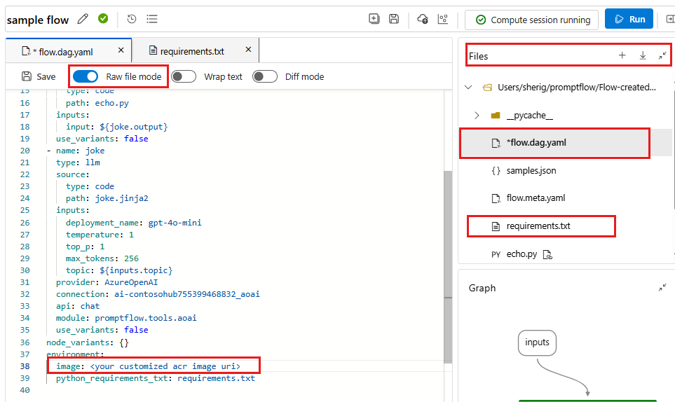 Si vous le souhaitez, vous pouvez spécifier des packages supplémentaires dont vous avez besoin dans requirements.txt. Vous trouverez requirements.txt dans le dossier racine de votre dossier de flux. Lorsque vous déployez un flux d’invite vers un point de terminaison en ligne géré via l'interface utilisateur, le déploiement utilise par défaut l’environnement créé à partir de l’image de base spécifiée dans flow.dag.yaml et des dépendances spécifiées dans requirements.txt.