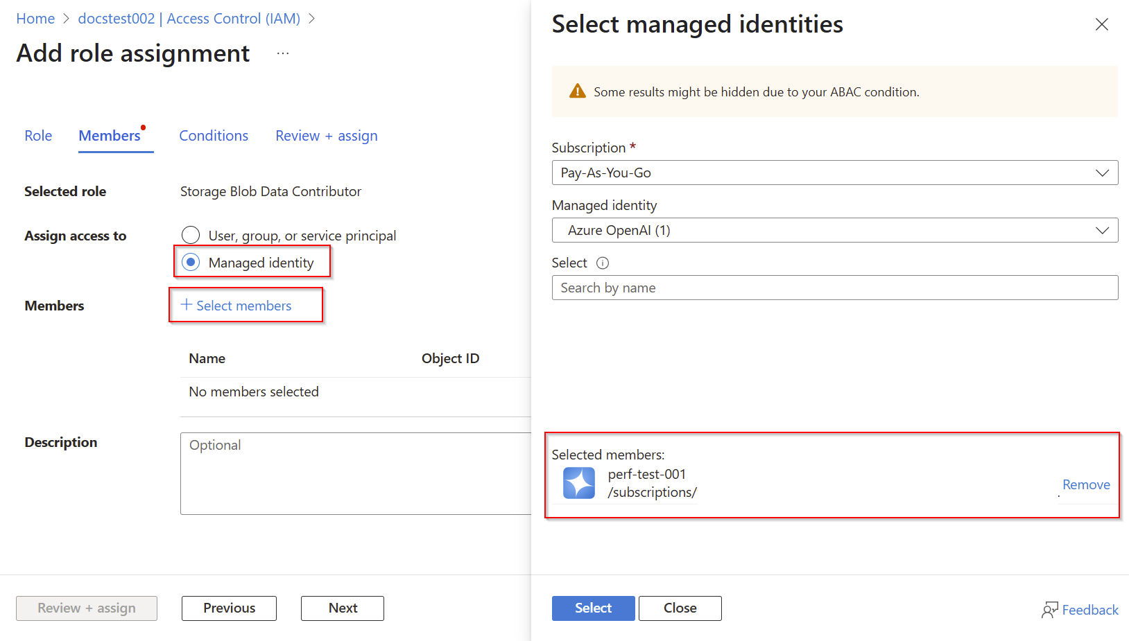 Sélectionnez Identité managée>+Sélectionner des membres> Sélectionnez l'identité managée de vos ressources OpenAI Azure.