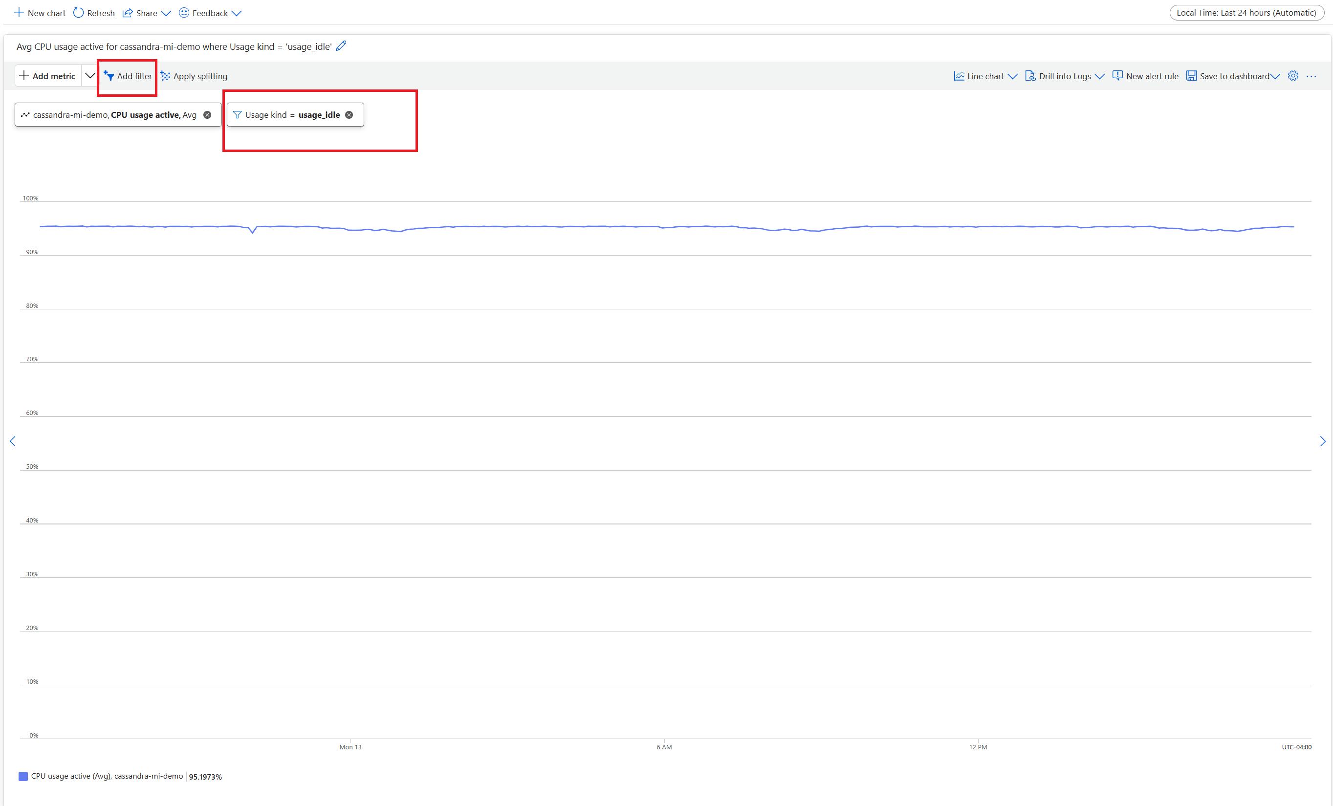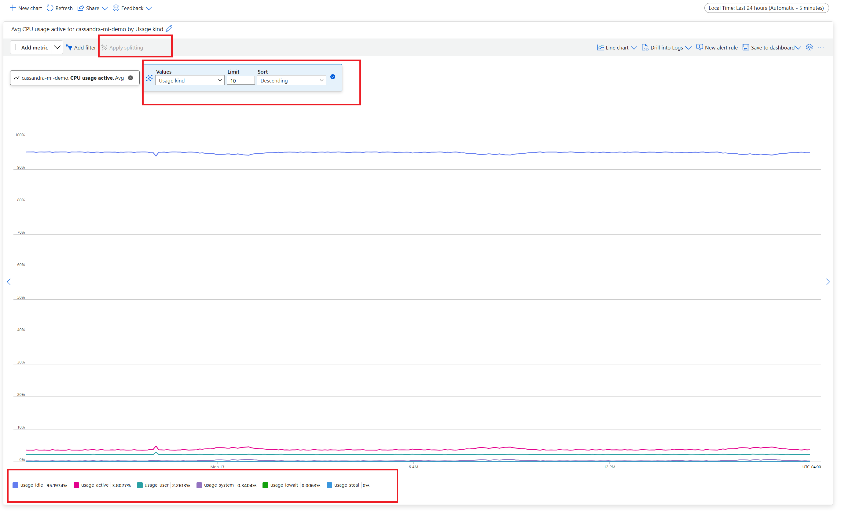 Pour une vue processeur réaliste, ajoutez un filtre et utilisez-le Usage kind=usage_idle pour fractionner la propriété. Si cette valeur est inférieure à 20%, appliquez la répartition pour obtenir l’utilisation par toutes les catégories d’utilisation.