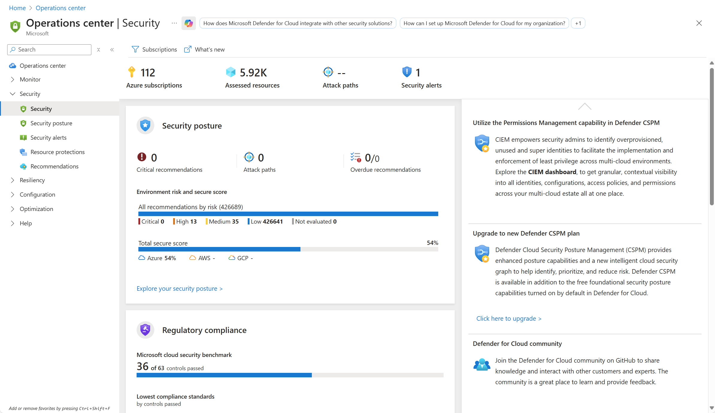 | Security | Vue unifiée de la sécurité sur toutes vos ressources Azure et toutes les ressources non-Azure que vous avez connectées. Il s’agit de la même page que la vue d’ensemble de Defender for Cloud. Consultez les articles suivants pour plus d’informations sur les fonctionnalités accessibles à partir de cette page. - Passer en revue la posture de sécurité cloud - Améliorer la conformité réglementaire - Passer en revue la protection des charges de travail - Passer en revue l’inventaire des ressources |