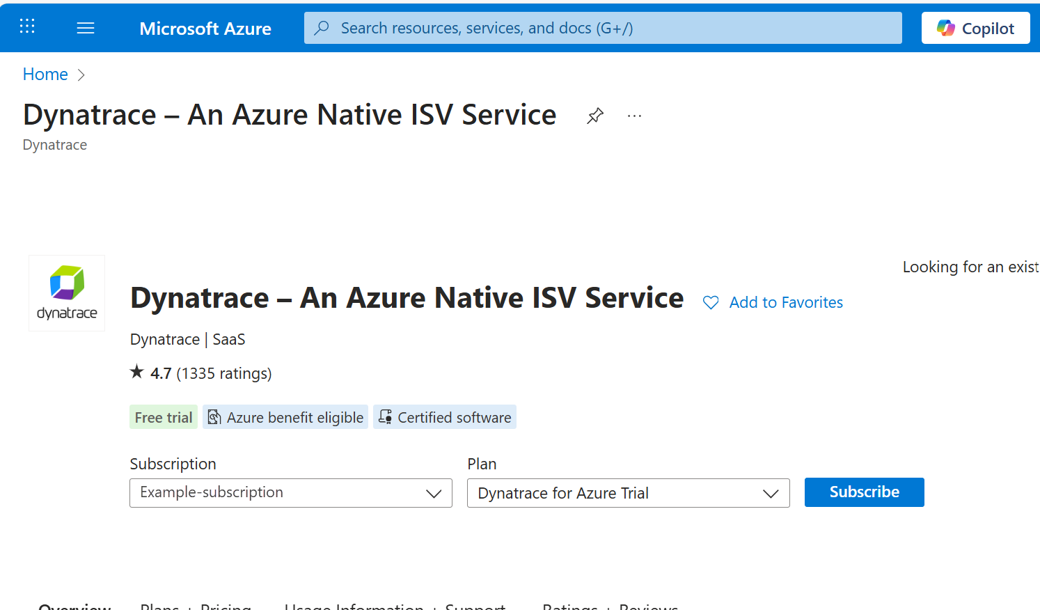 Dans la page Dynatrace – Un service ISV Natif Azure , sélectionnez S’abonner.