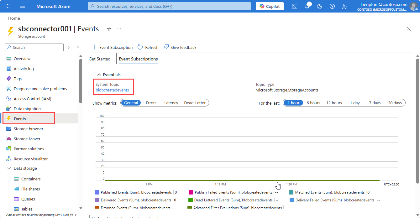 Passez en revue les métriques d’abonnement Event Grid pour valider que les messages sont correctement publiés dans la file d’attente de stockage après cette mise à jour.