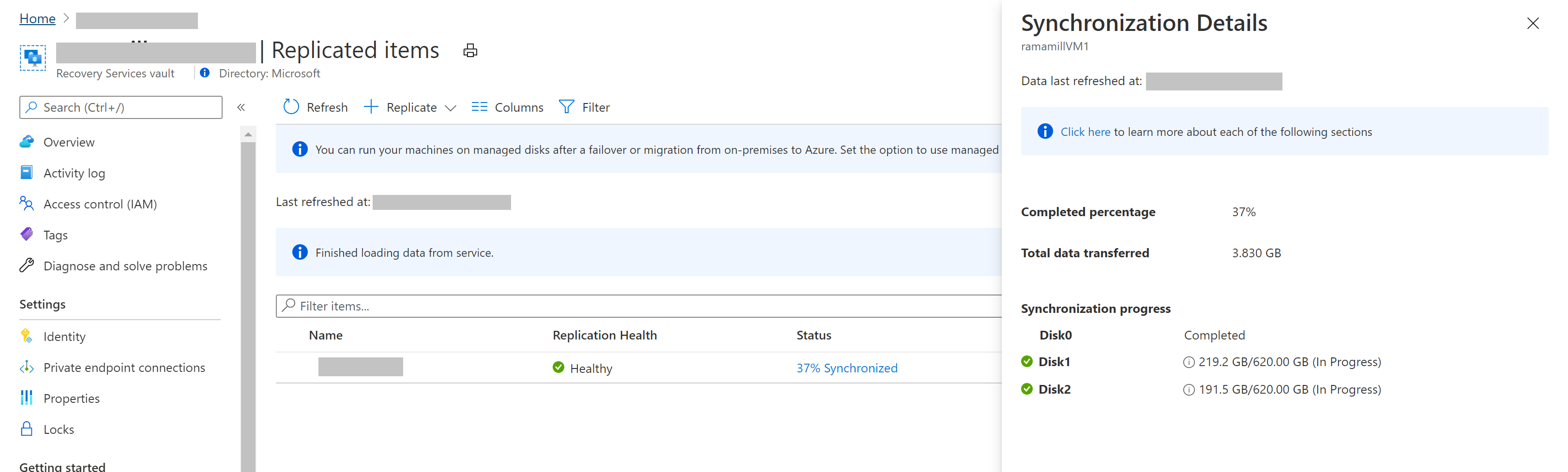 - Lorsque vous sélectionnez la bulle d’informations sur un disque, vous voyez des détails sur le moment où la réplication (synchronisation) a été déclenchée pour le disque, les données transférées vers Azure au cours des 15 dernières minutes et le dernier horodatage actualisé. Cet horodatage affiche la dernière heure à laquelle le service Azure reçoit des informations de la machine source.