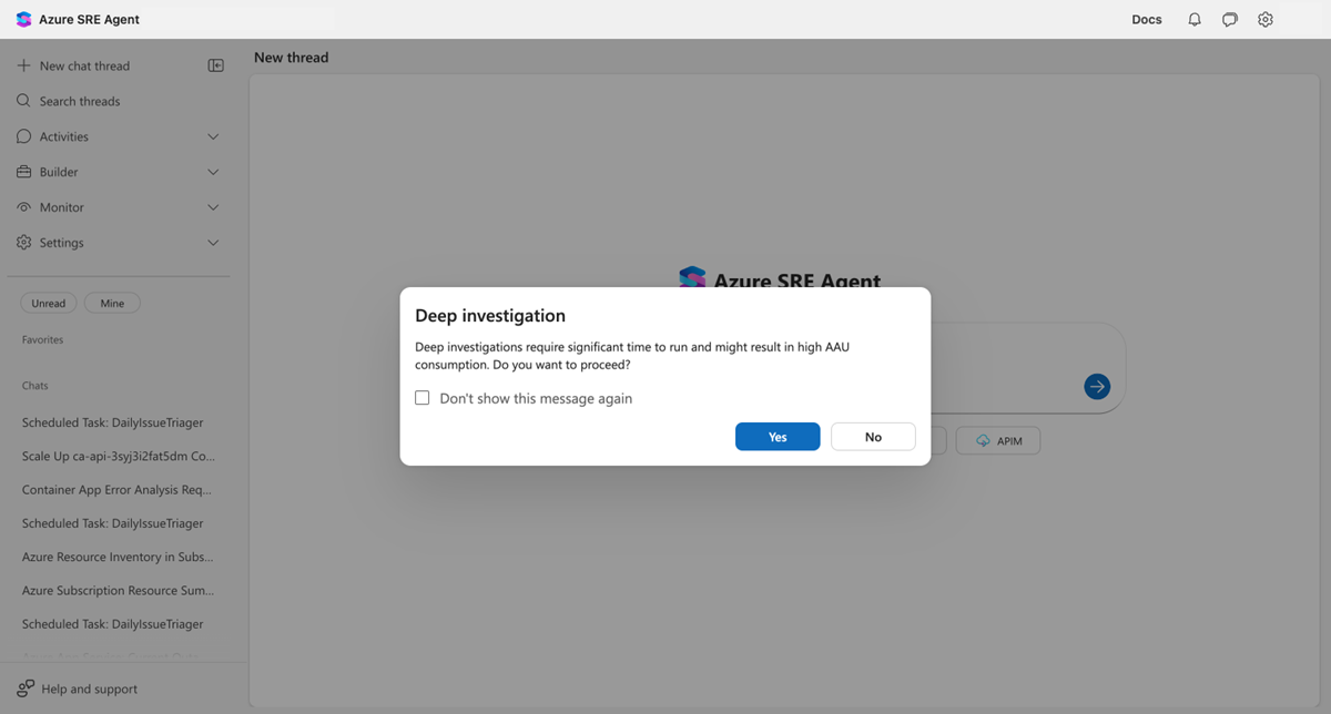 - Continuer : Approuvez l’investigation et accordez à votre agent des autorisations élevées pour interroger vos ressources Azure.