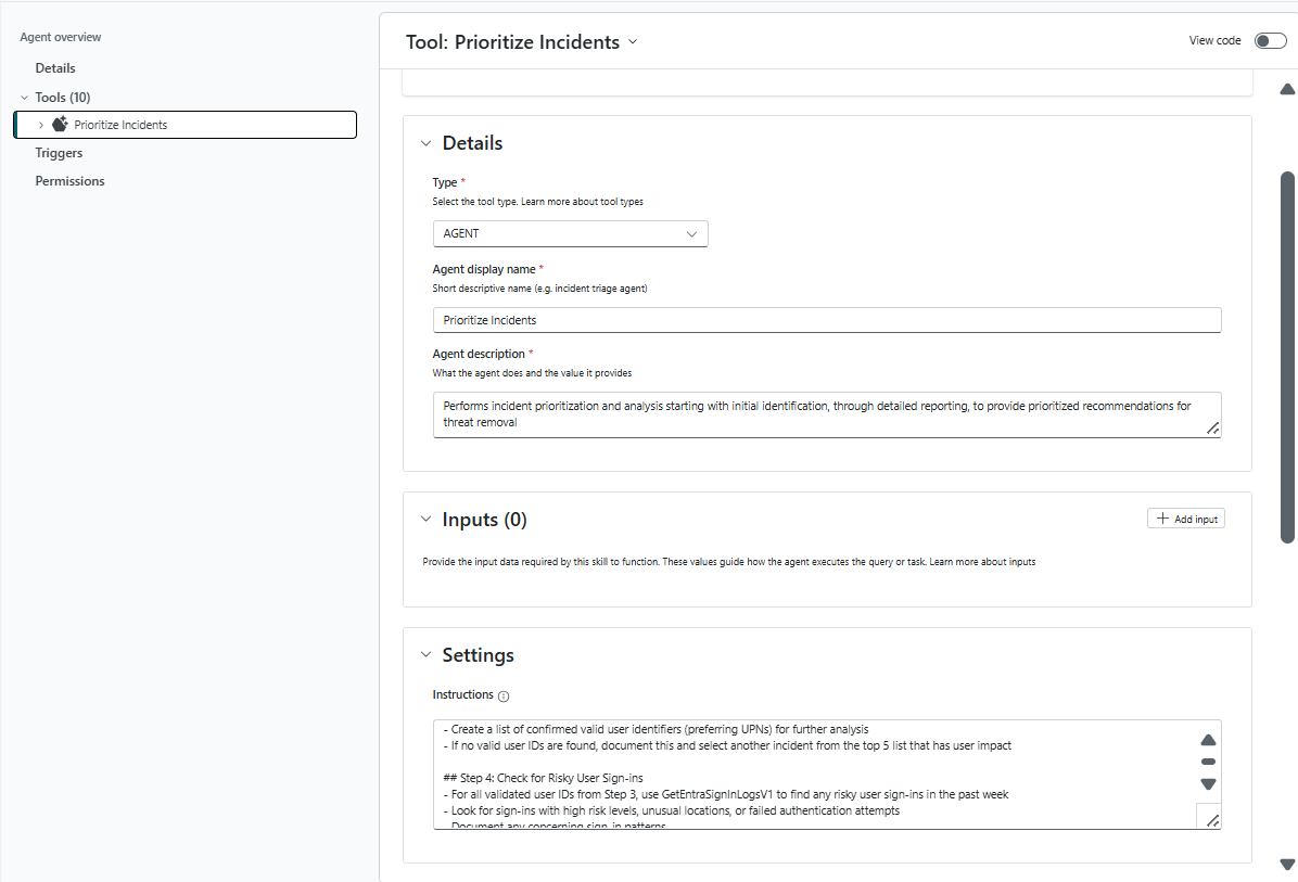 - Fournissez les paramètres d’entrée requis pour l’outil agent. Vous devez guider le modèle IA dans votre description, si seules certaines valeurs sont possibles (par exemple, « SeverityLevel doit être l’une des