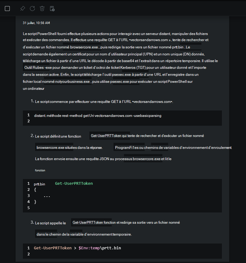 Microsoft Defender XDR indicateurs lorsqu’un script suspect s’exécute. Utilisez Security Copilot pour expliquer ce que fait le script suspect.