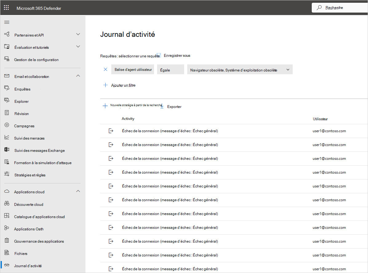 Par exemple, vous pouvez utiliser le journal d’activité pour rechercher des utilisateurs dans votre organization qui utilisent des systèmes d’exploitation ou des navigateurs obsolètes, comme suit : Après avoir connecté une application à Defender for Cloud Apps dans la page Journal d’activité, utilisez le filtre avancé et sélectionnez Balise Agent utilisateur. Sélectionnez ensuite Navigateur obsolète ou Système d’exploitation obsolète.