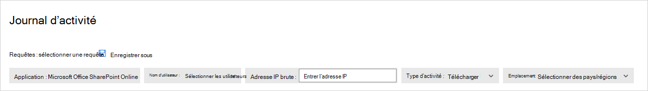 Le journal d’activité peut être filtré pour vous permettre de rechercher des activités spécifiques. Vous créez des stratégies basées sur les activités, puis définissez ce dont vous souhaitez être alerté et agir. Vous pouvez rechercher des activités effectuées sur certains fichiers. Le type d’activités et les informations que nous obtenons pour chaque activité dépendent de l’application et du type de données que l’application peut fournir.