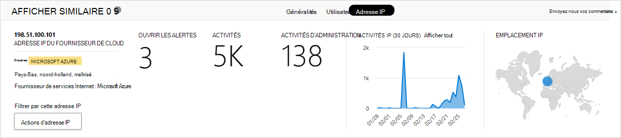 activités Administration : nombre d’activités administratives effectuées à partir de cette adresse IP au cours des 30 derniers jours. Vous pouvez effectuer les actions d’adresse IP suivantes :