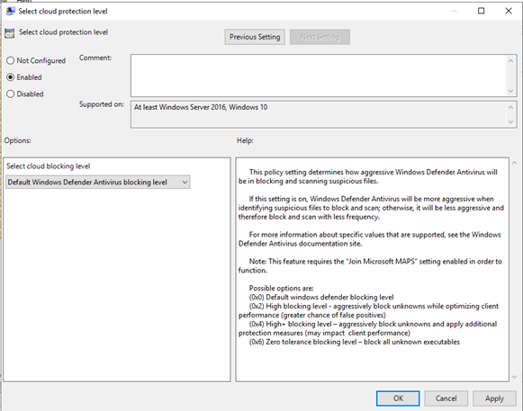 Lorsque vous configurez la stratégie de niveau de protection cloud sur La stratégie de blocage antivirus Microsoft Defender par défaut, cela désactive la stratégie. C’est ce qui est nécessaire pour définir le niveau de protection par défaut de Windows.