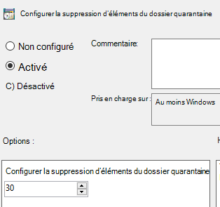 Dans le dossier Quarantaine , configurez la suppression des éléments du dossier Quarantaine.