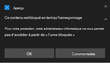 Par défaut, les verdicts SmartScreen pour les sites malveillants entraînent un avertissement qui peut être remplacé par l’utilisateur. Une stratégie peut être définie pour convertir l’avertissement en blocs, ce qui empêche de tels remplacements.