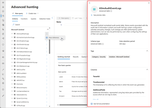Lorsque vous ouvrez la page de repérage avancé pour la première fois après la connexion d’un espace de travail, vous pouvez trouver de nombreuses tables de cet espace de travail organisées par solution après l’Microsoft Defender XDR tables sous l’onglet Schéma.