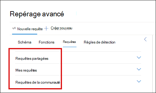 Sous l’onglet Requêtes de la chasse avancée, vous trouverez les menus déroulants pour Requêtes partagées, Mes requêtes et Requêtes de communauté. Vous pouvez sélectionner une flèche vers le bas pour développer un menu.