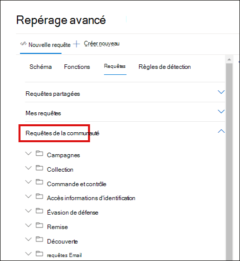 Les requêtes de la communauté sont regroupées dans des dossiers tels que Campagnes, Collection, Évasion de défense, etc. Des informations supplémentaires sur la requête sont fournies sous forme de commentaires en ligne dans la requête elle-même.