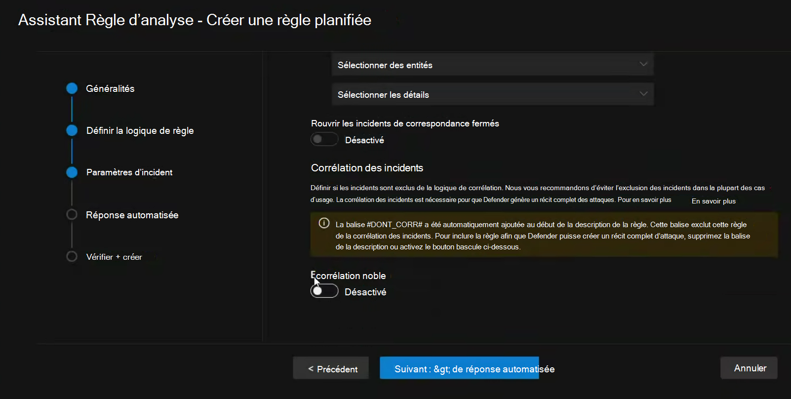 Sous l’onglet Paramètres de l’incident , vérifiez que le bouton bascule Activer la corrélation est défini sur Désactivé.
