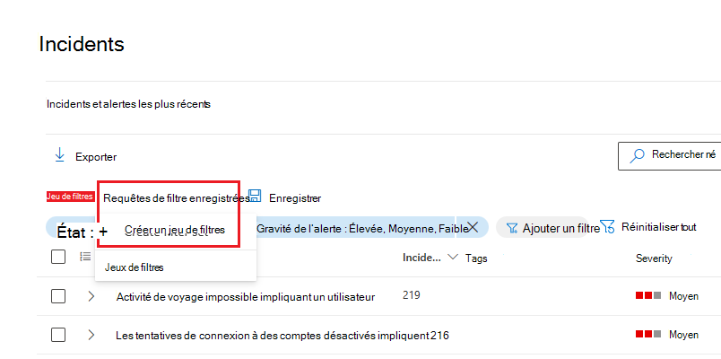 Vous pouvez également créer des jeux de filtres dans la page des incidents en sélectionnant Requêtes > de filtre enregistrées Créer un jeu de filtres. Si aucun jeu de filtres n’a été créé, sélectionnez Enregistrer pour en créer un.