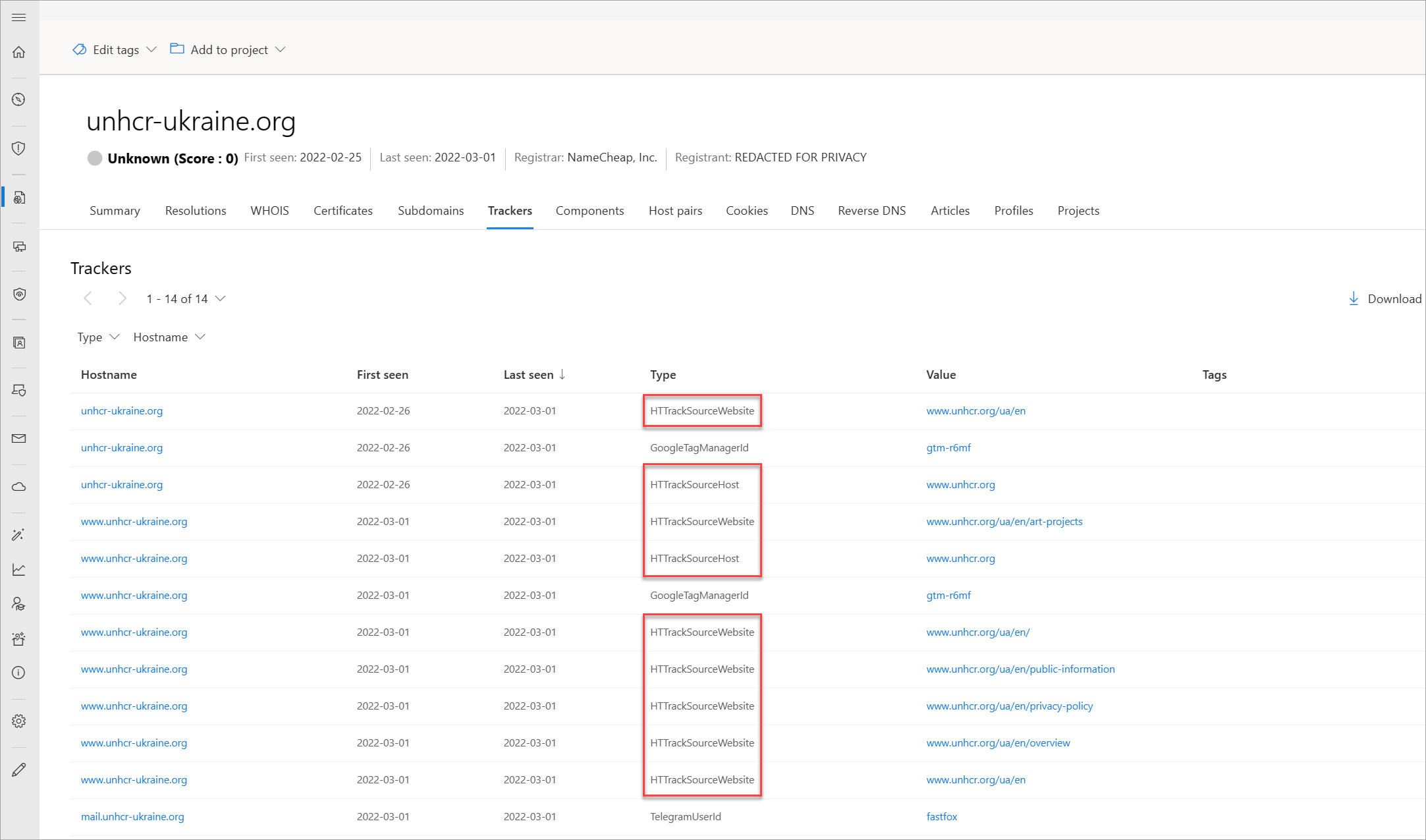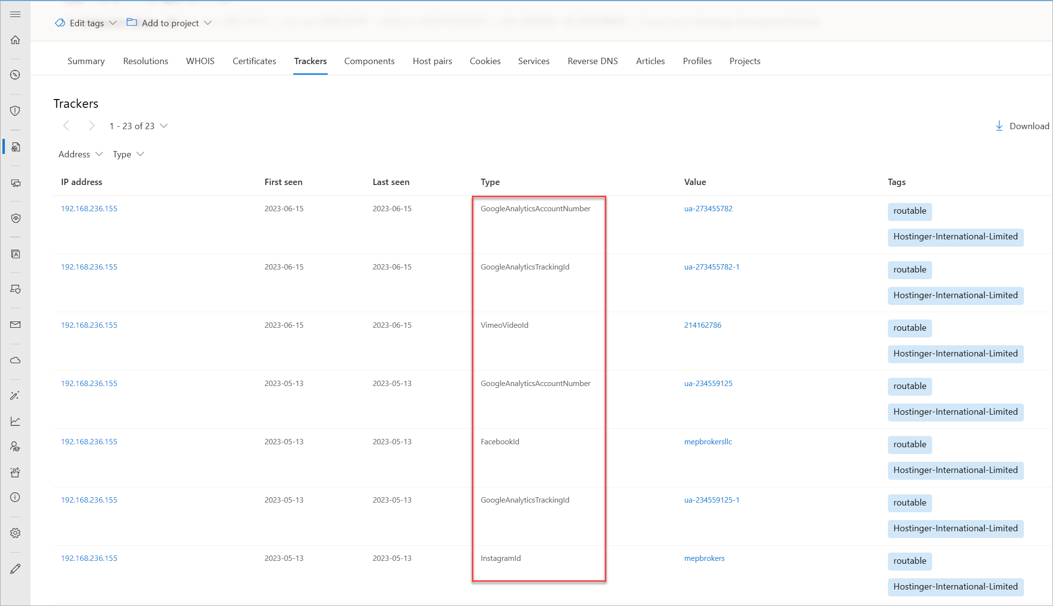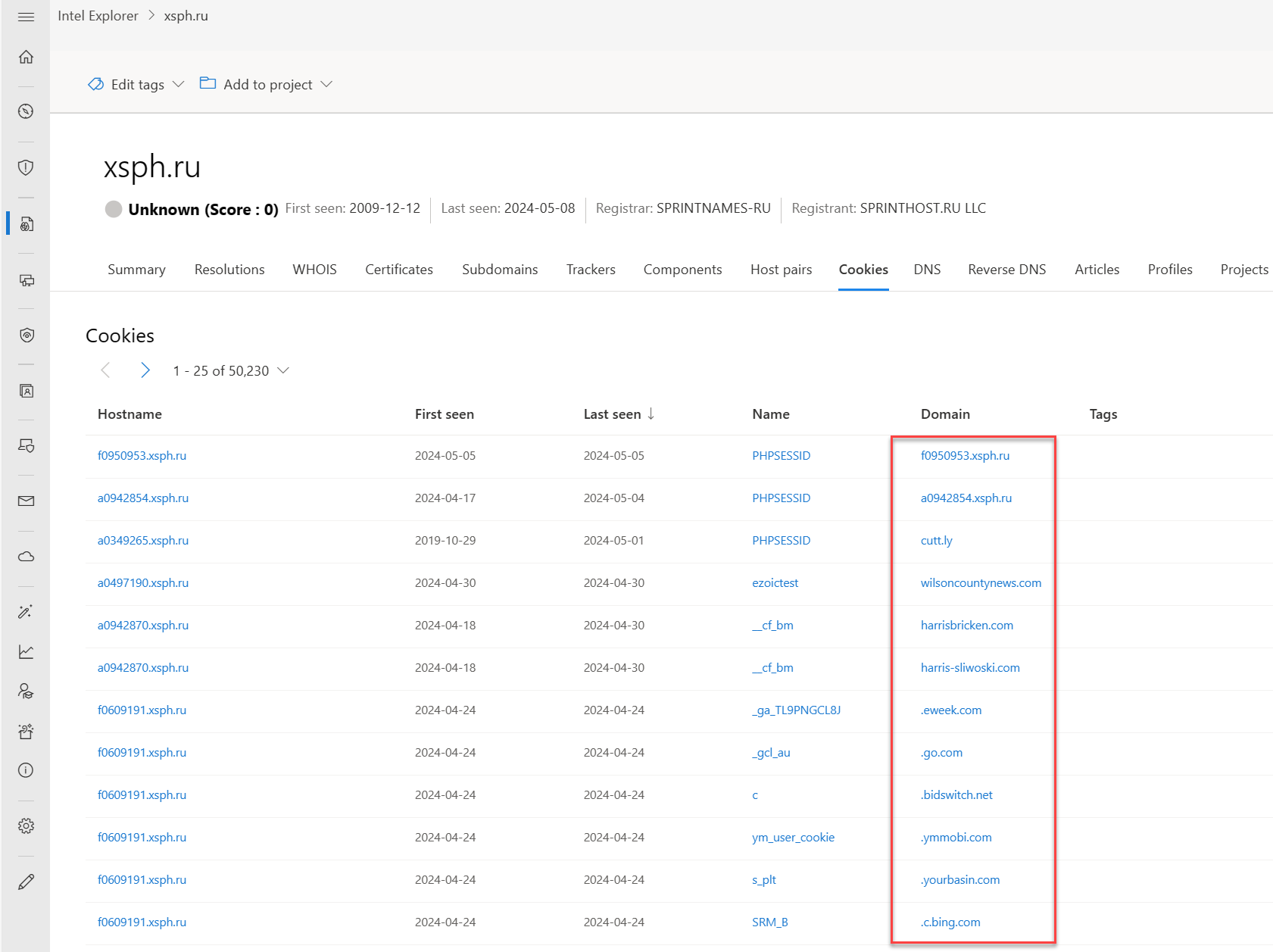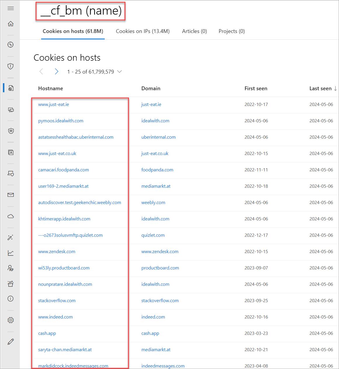 Les cookies sont de petits éléments de données envoyés d’un serveur à un client lorsque l’utilisateur navigue sur Internet. Ces valeurs contiennent parfois un état pour l’application ou de petits bits de données de suivi. Defender TI met en évidence et indexe les noms de cookies observés lors de l’analyse d’un site web et vous permet d’explorer tous les emplacements où nous avons observé des noms de cookies spécifiques dans son analyse et sa collecte de données. Les acteurs malveillants utilisent également des cookies pour suivre les victimes infectées ou stocker les données qu’ils pourraient utiliser ultérieurement.