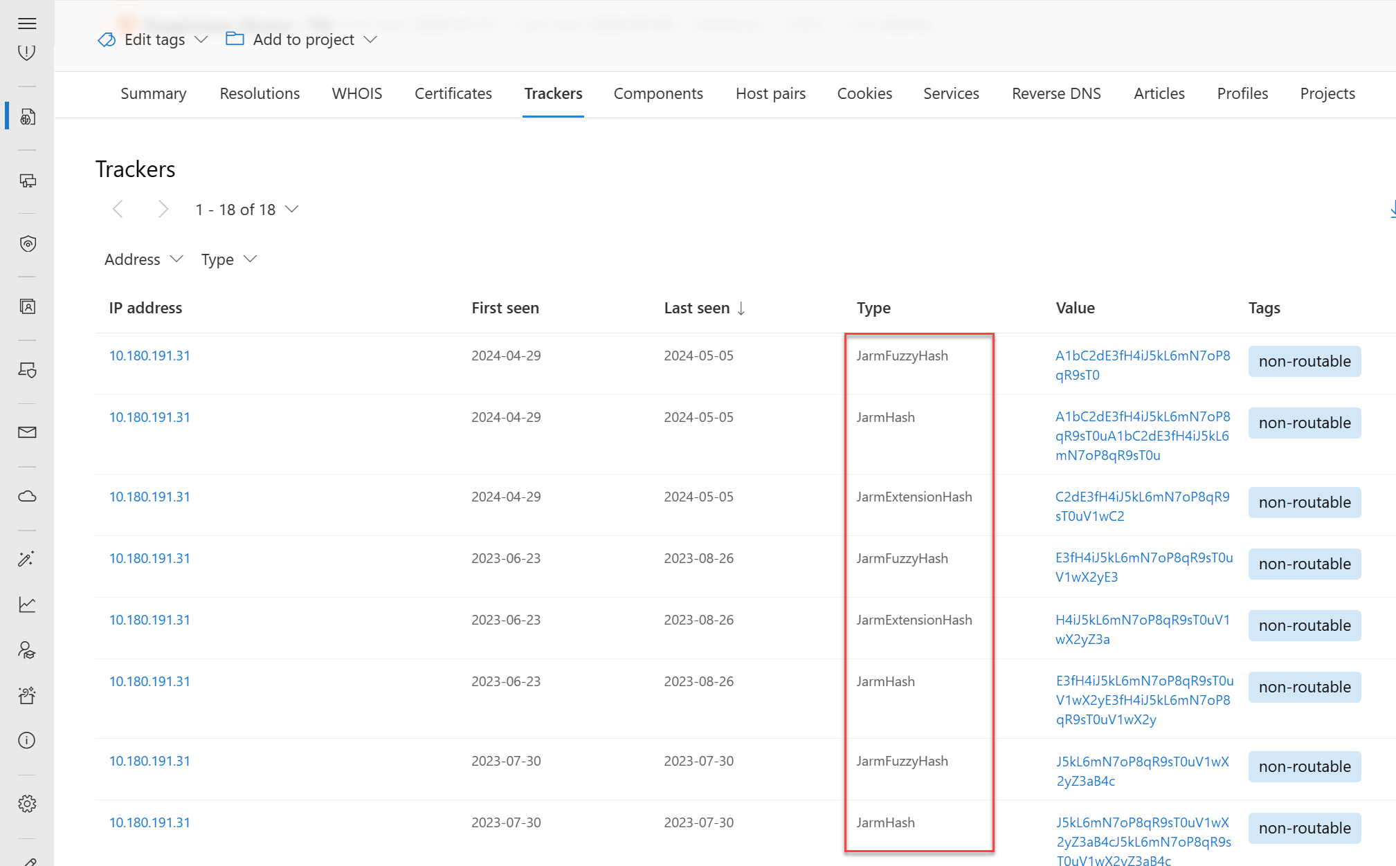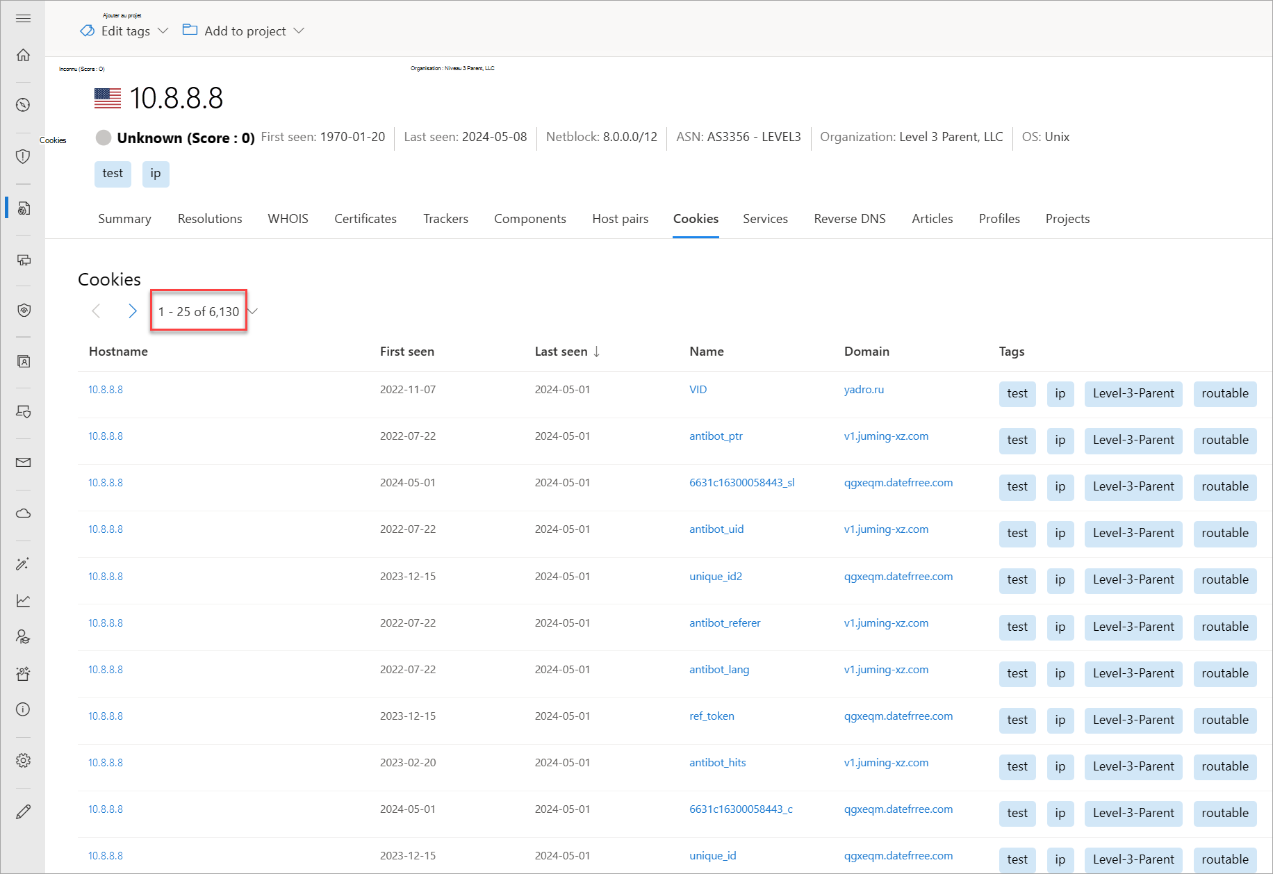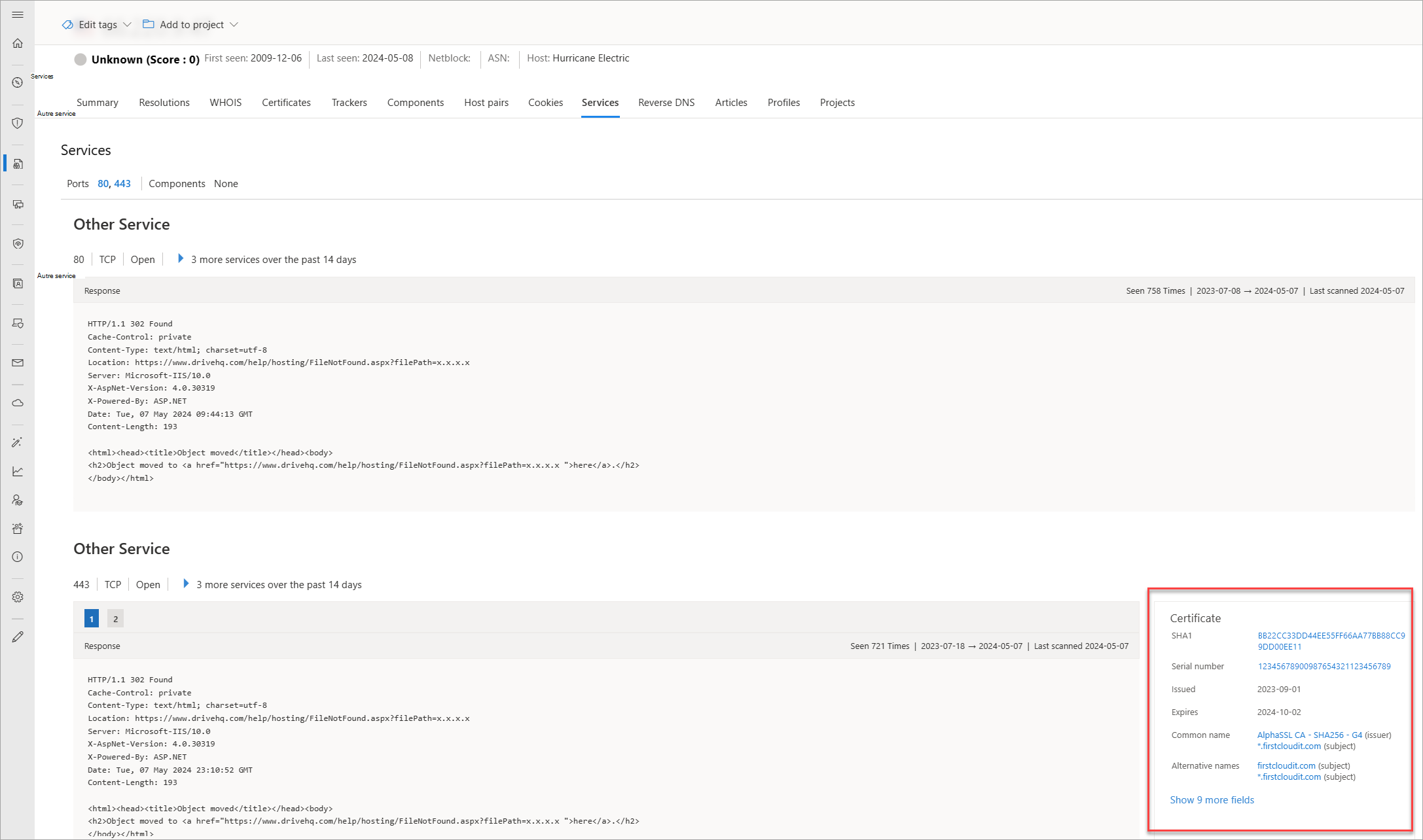 Les certificats TLS sont des fichiers qui lient numériquement une clé de chiffrement à un ensemble de détails fournis par l’utilisateur. Defender TI utilise des techniques d’analyse Internet pour collecter des associations de certificats TLS à partir d’adresses IP sur différents ports. Ces certificats sont stockés dans une base de données locale et nous permettent de créer un chronologie pour l’endroit où un certificat TLS donné est apparu sur Internet.