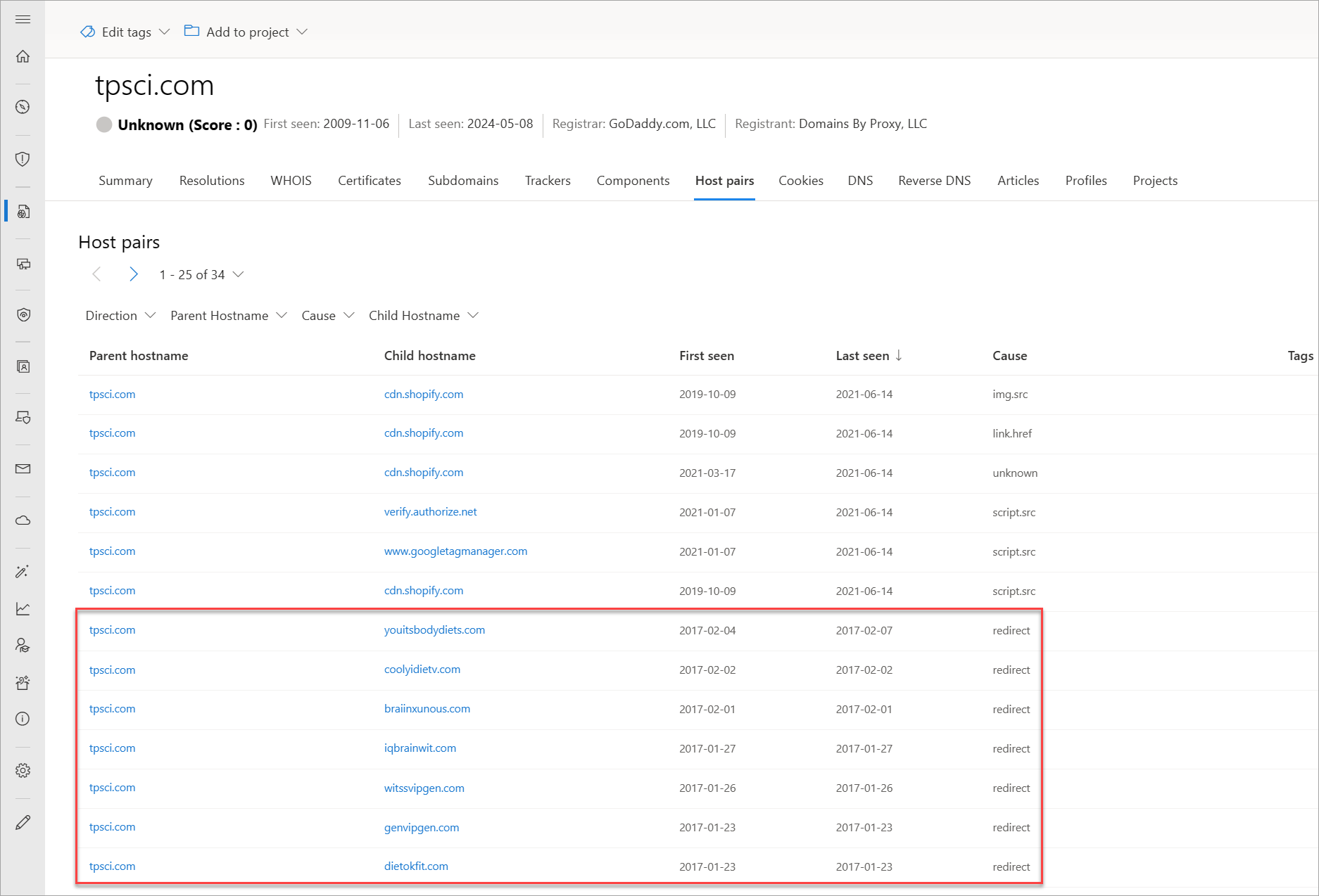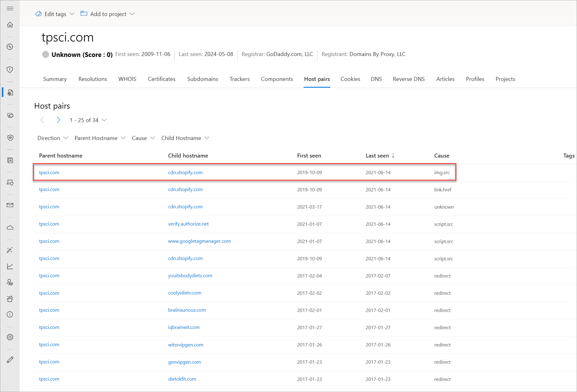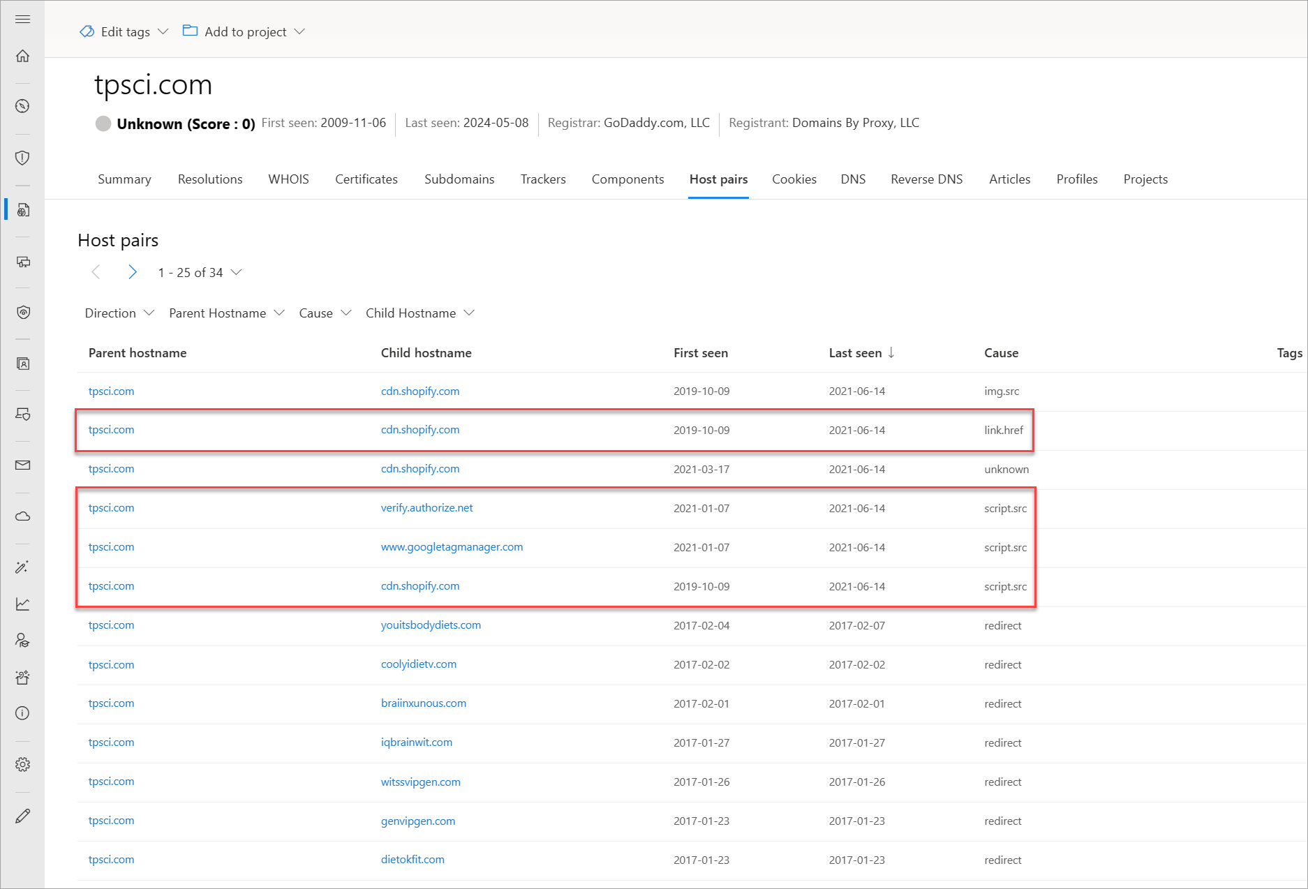Les paires d’hôtes sont deux éléments d’infrastructure (un parent et un enfant) qui partagent une connexion observée à partir de l’analyse web d’un utilisateur virtuel. La connexion peut aller d’une redirection de niveau supérieur (HTTP 302) à quelque chose de plus complexe, comme une référence de source d’iFrame ou de script.