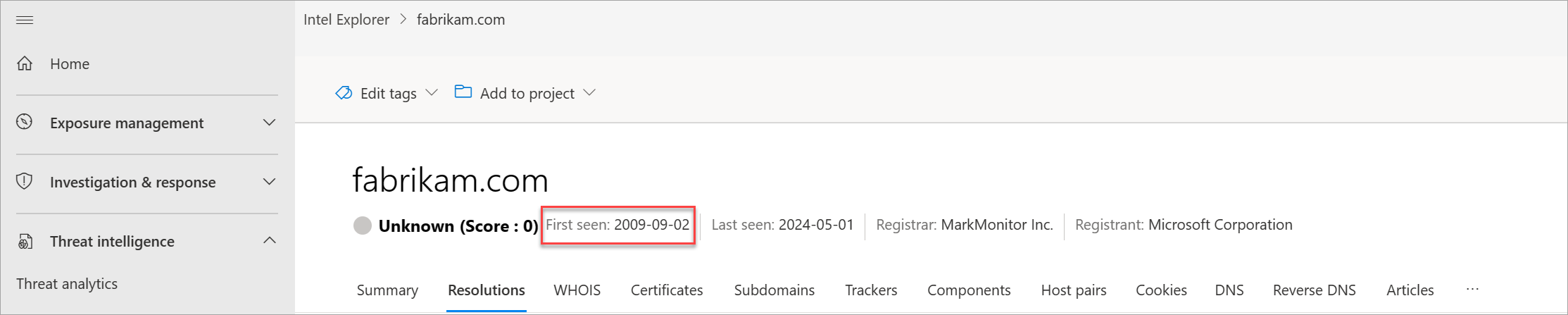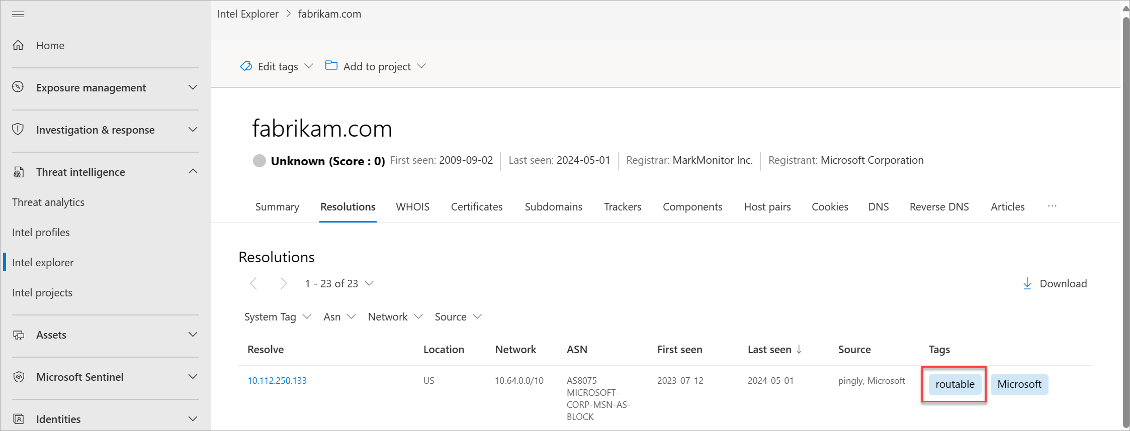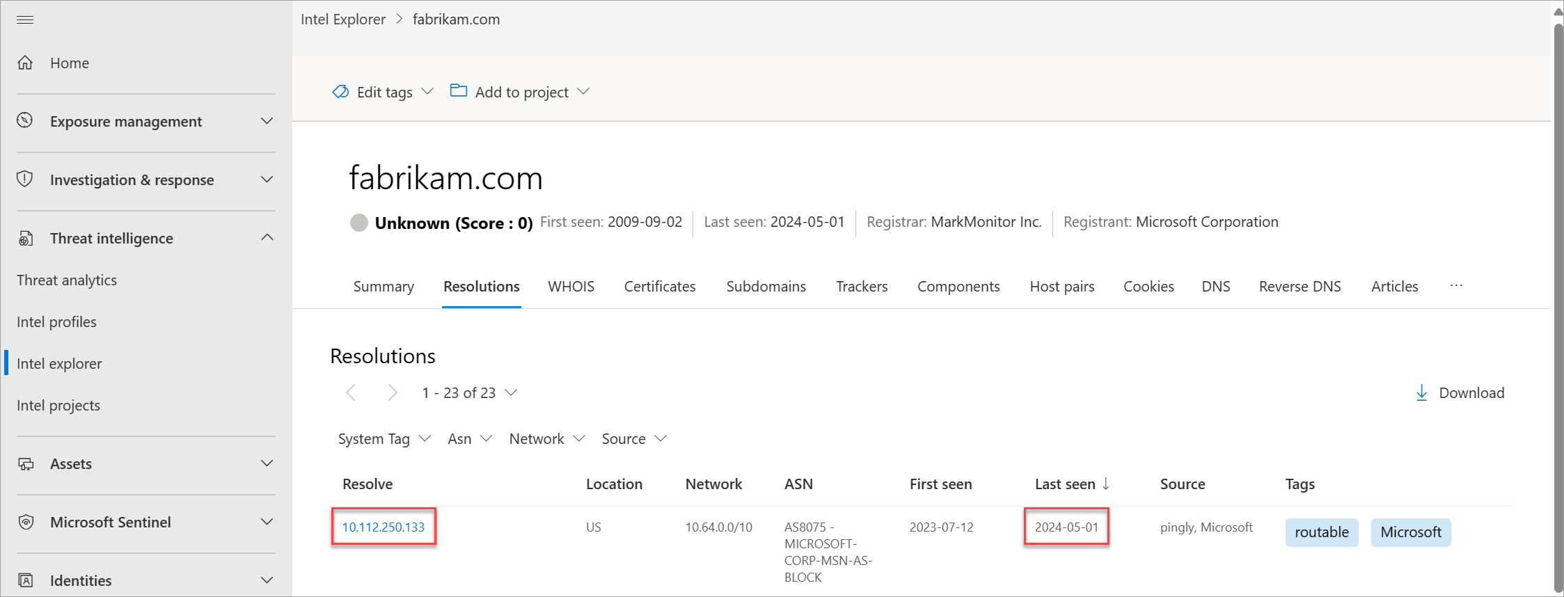 LE PDNS peut permettre l’identification d’une infrastructure d’acteur de menace précédemment inconnue ou nouvellement mise en place. L’ajout proactif d’indicateurs aux listes de blocage peut couper les chemins de communication avant que les campagnes n’ont lieu. Les données de résolution d’enregistrements sont disponibles sous l’onglet Résolutions, qui se trouve dans la page de l’Explorateur Intel du portail Microsoft Defender. D’autres types d’enregistrements DNS sont disponibles dans l’onglet DNS .