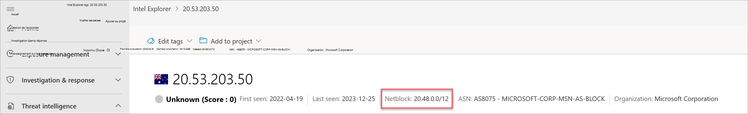 - Réseau : netblock ou sous-réseau associé à l’adresse IP