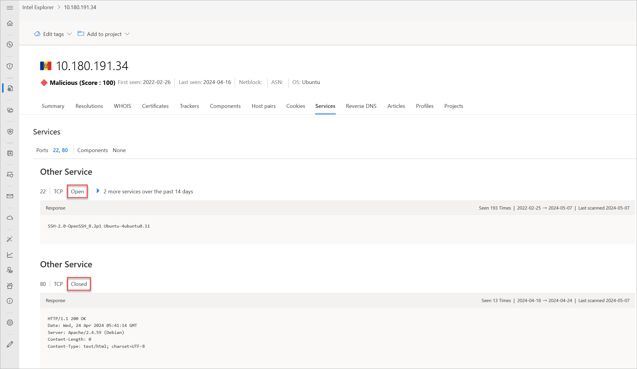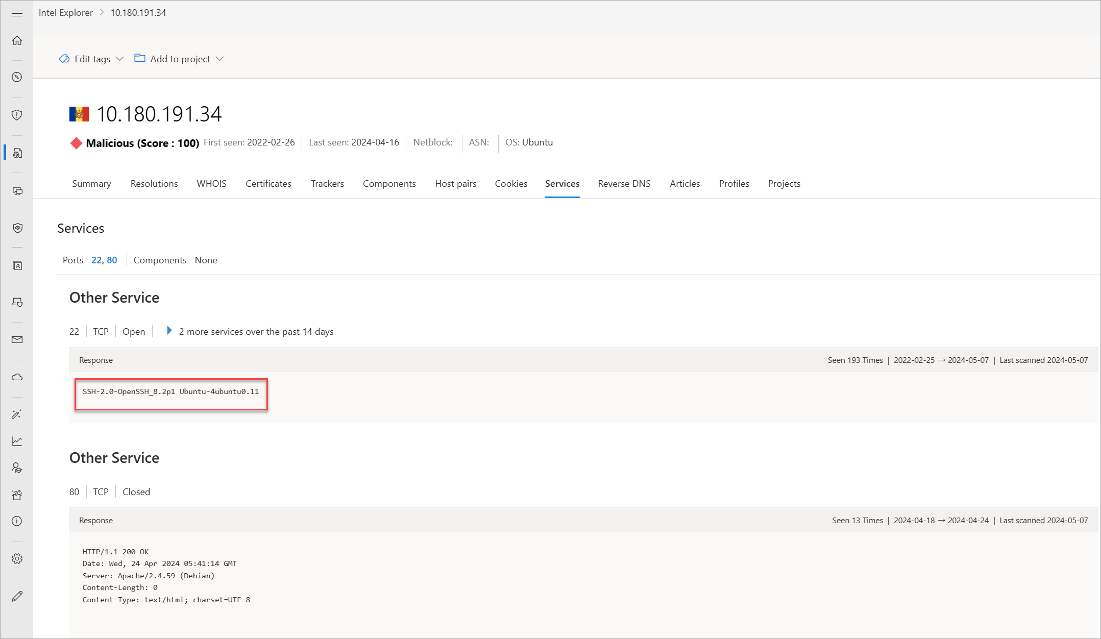 Les noms de service et les numéros de port sont utilisés pour distinguer les différents services qui s’exécutent sur des protocoles de transport tels que TCP, UDP, DCCP et SCTP. Les numéros de port peuvent suggérer le type d’application en cours d’exécution sur un port particulier. Toutefois, les applications ou les services peuvent être modifiés pour utiliser un port différent pour masquer ou masquer l’application ou le service sur une adresse IP. Connaître les informations de port et d’en-tête/bannière peut identifier l’application/le service véritable et la combinaison de ports utilisés. Defender TI affiche 14 jours d’historique dans l’onglet Services , affichant la dernière réponse de bannière associée à un port observé.