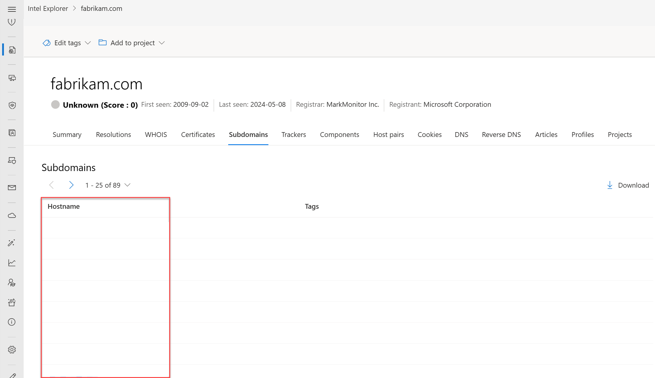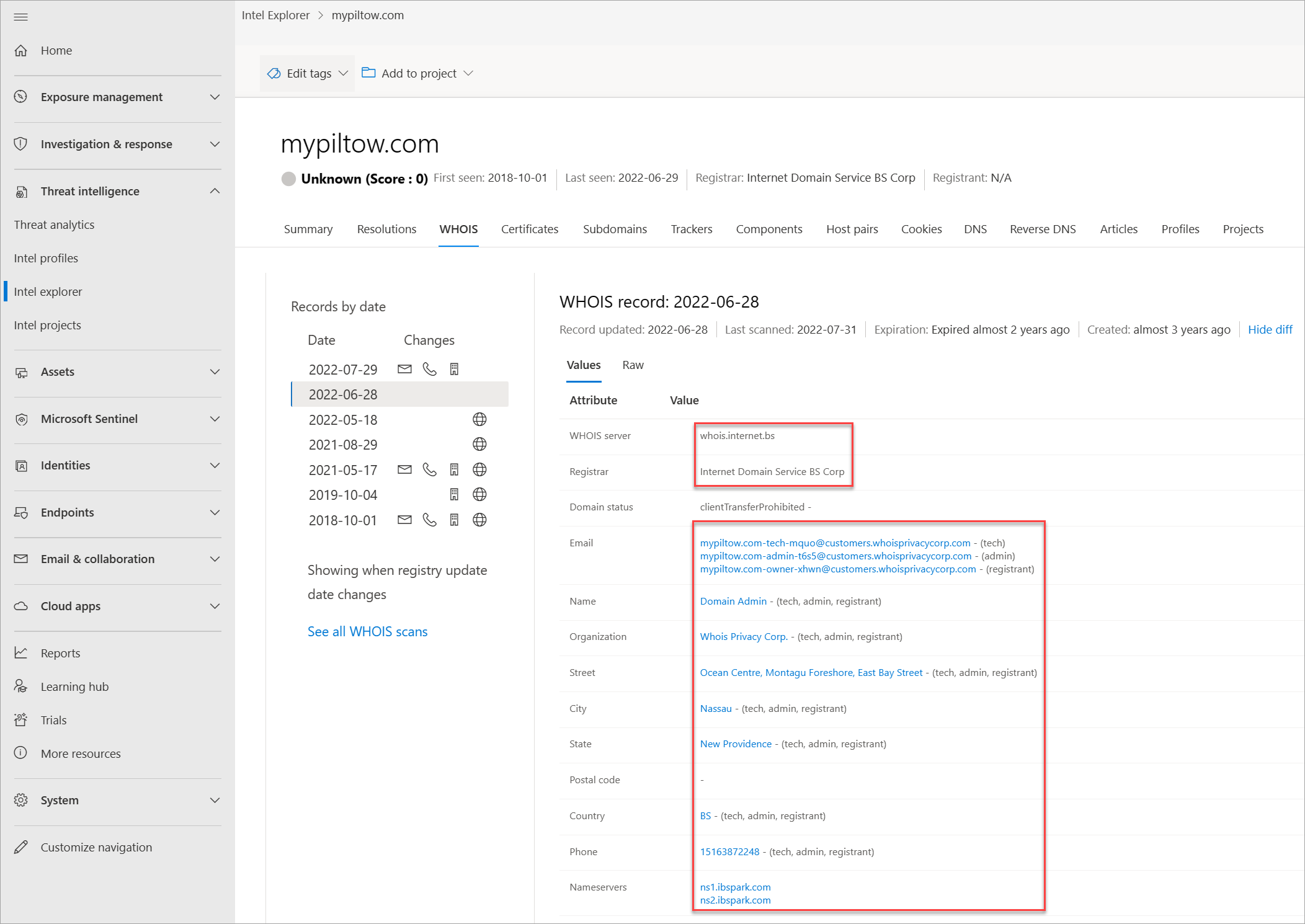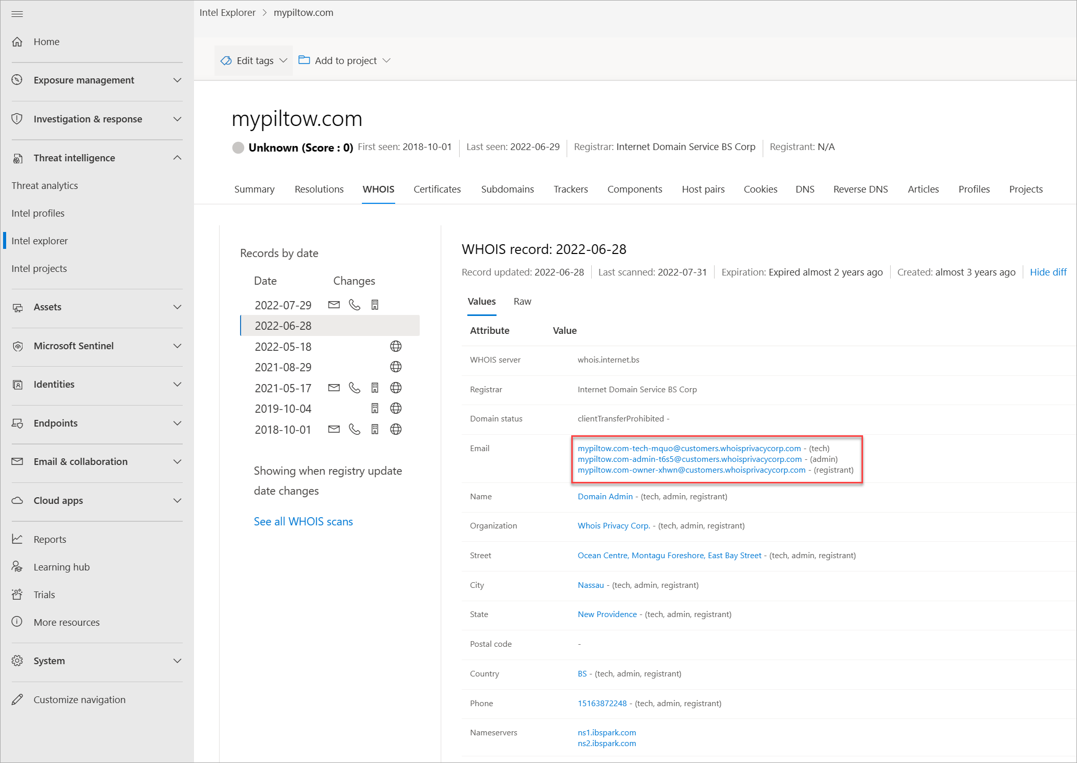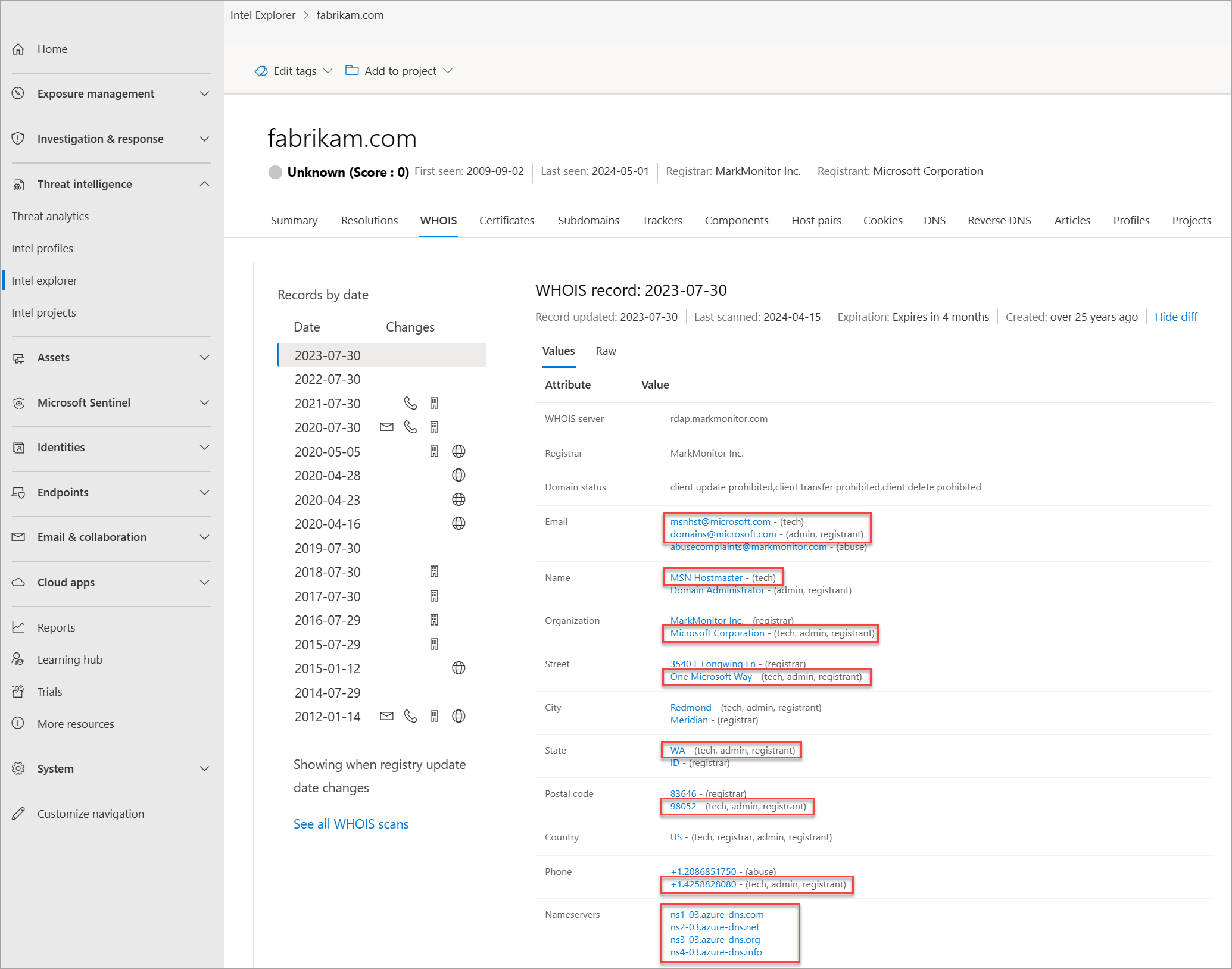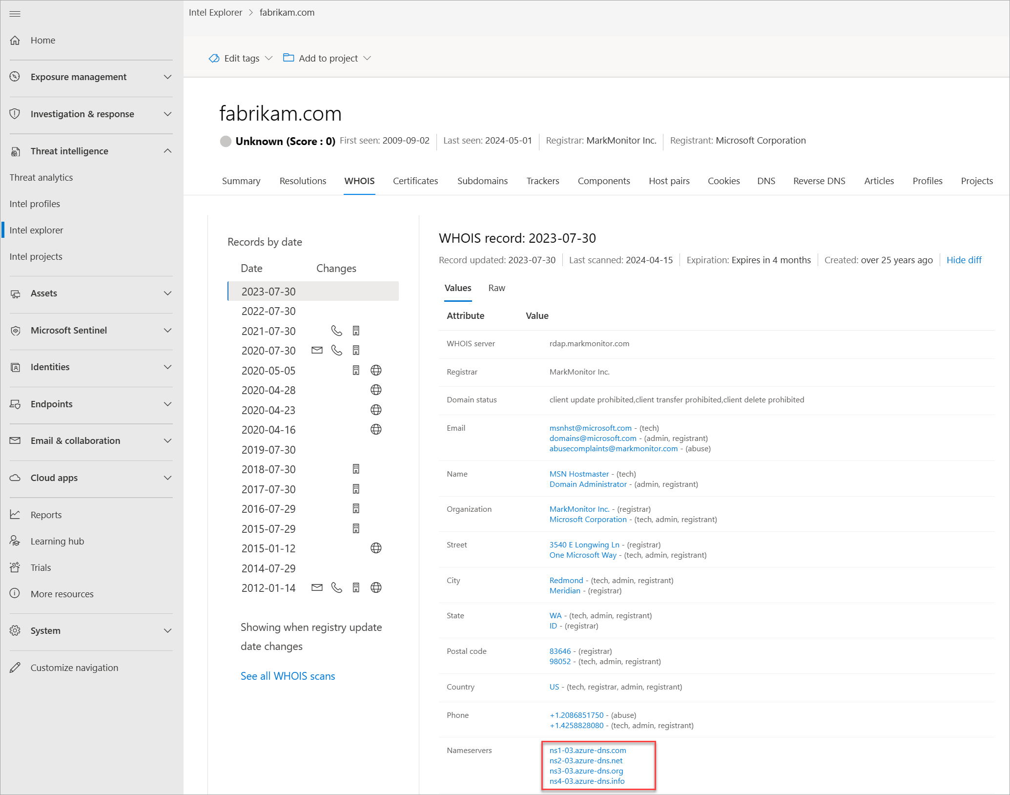 Microsoft a collecté des enregistrements DNS au fil des ans, vous fournissant des informations sur les enregistrements d’échange de courrier (MX), de serveur de noms (NS), de texte (TXT), de début d’autorité (SOA), de nom canonique (CNAME) et de pointeur (PTR). L’examen des enregistrements DNS peut aider à identifier l’infrastructure partagée utilisée par les acteurs dans les domaines dont ils sont propriétaires. Par exemple, les acteurs des menaces ont tendance à utiliser les mêmes serveurs de noms pour segmenter leur infrastructure ou les mêmes serveurs d’échange de courrier pour administrer leur commande et leur contrôle.