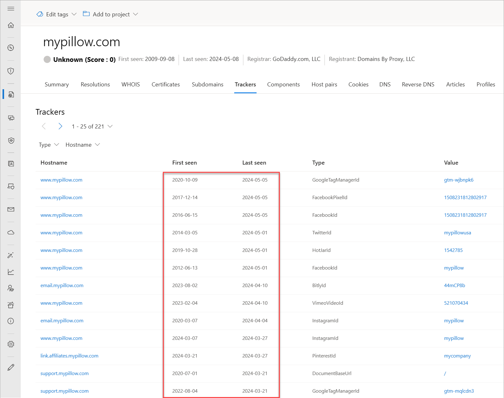 - Dernière vue : horodatage de la date à laquelle Microsoft a observé cet enregistrement pour la dernière fois sur l’artefact