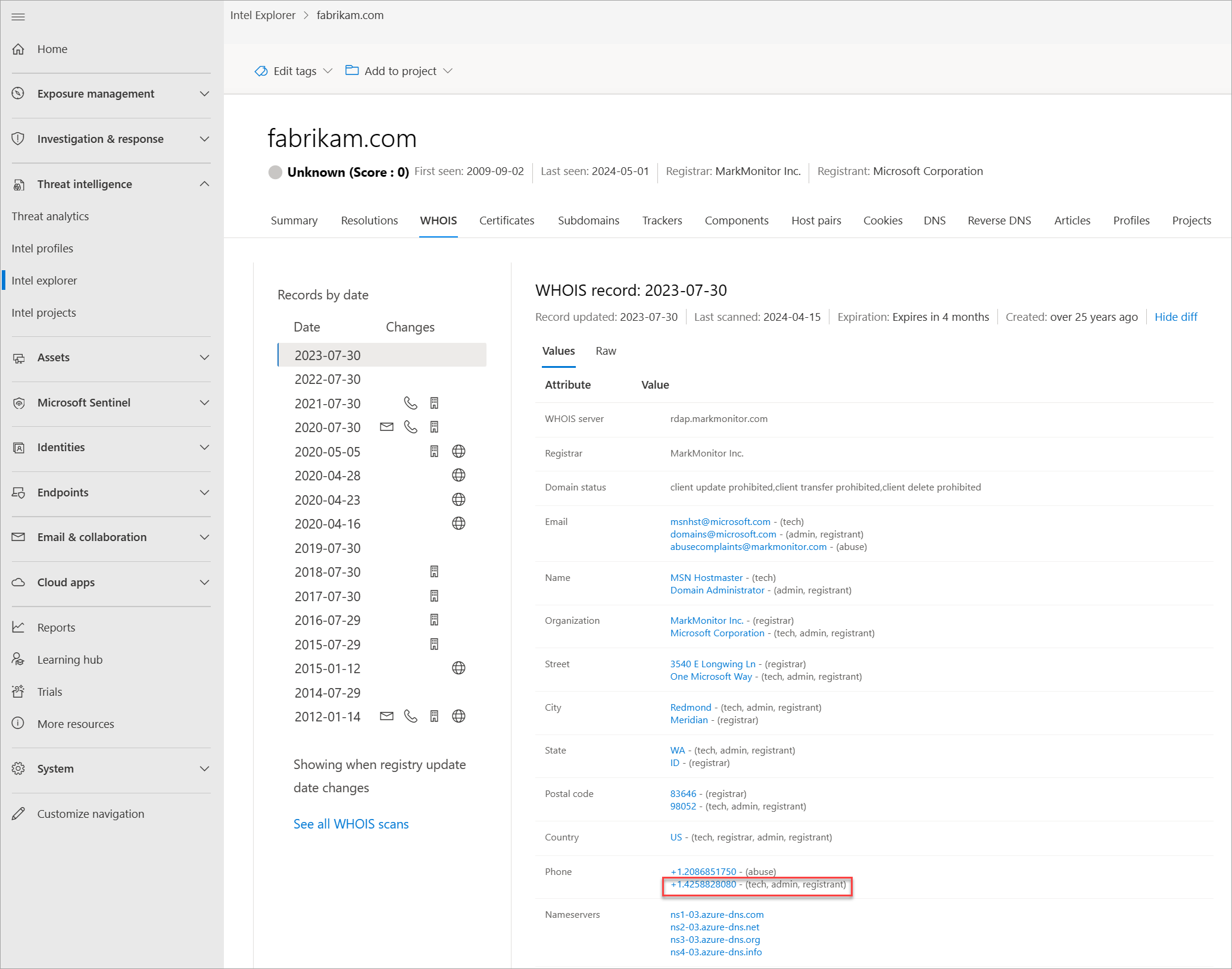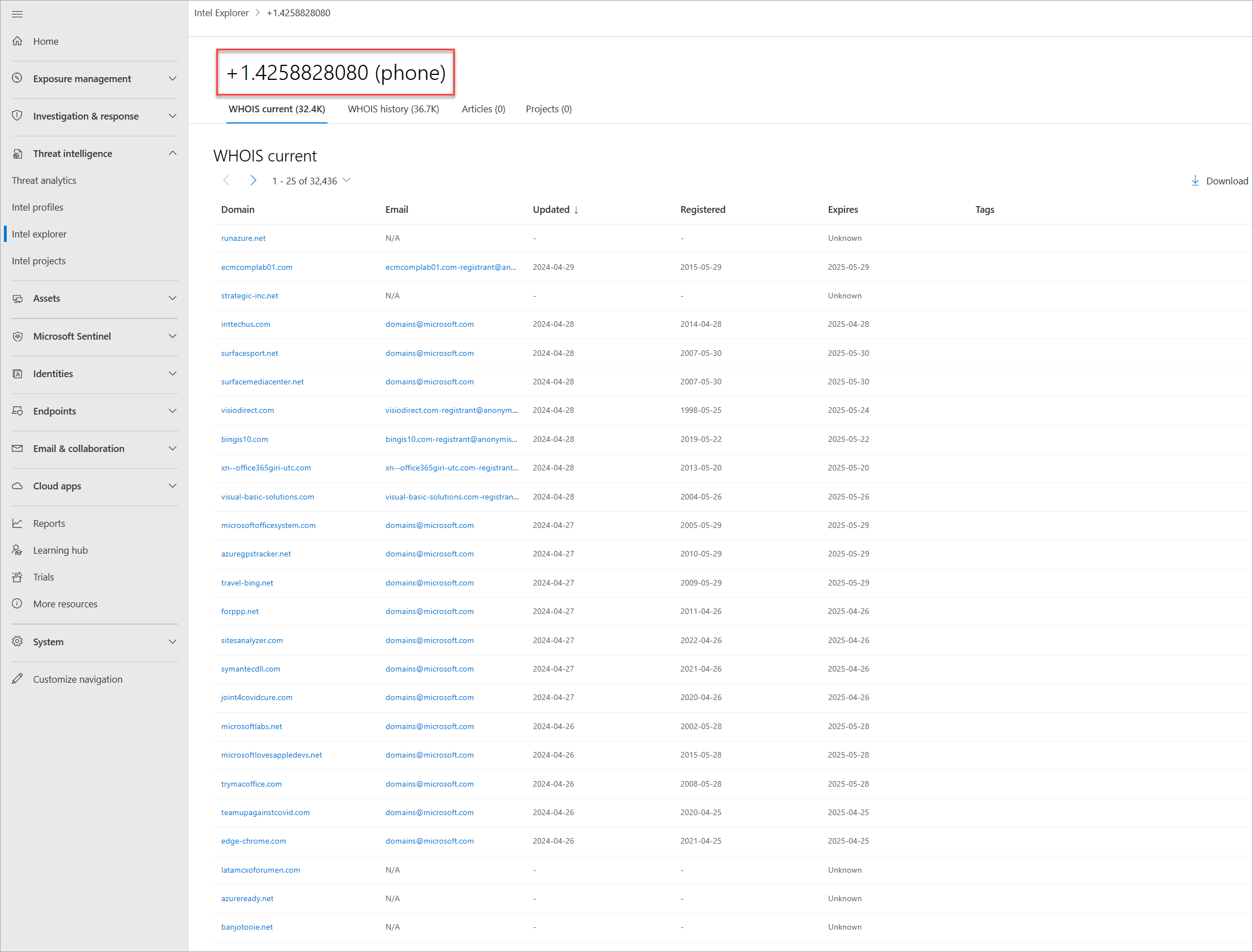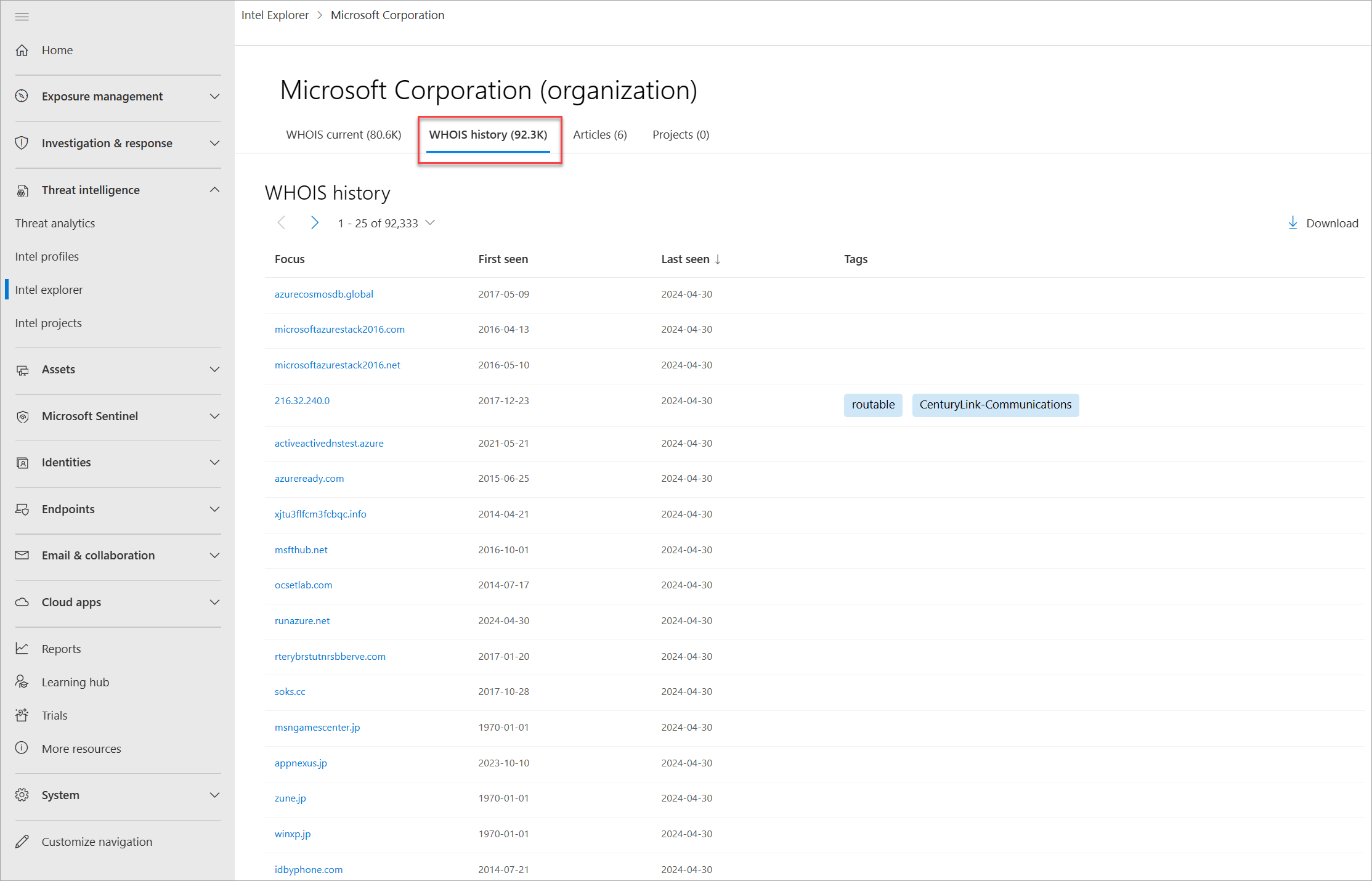 Microsoft centralise de nombreux jeux de données dans Microsoft Defender Threat Intelligence (Defender TI), ce qui permet aux clients et à la communauté de Microsoft d’effectuer plus facilement l’analyse de l’infrastructure. L’objectif principal de Microsoft est de fournir autant de données que possible sur l’infrastructure Internet pour prendre en charge différents cas d’usage de sécurité.