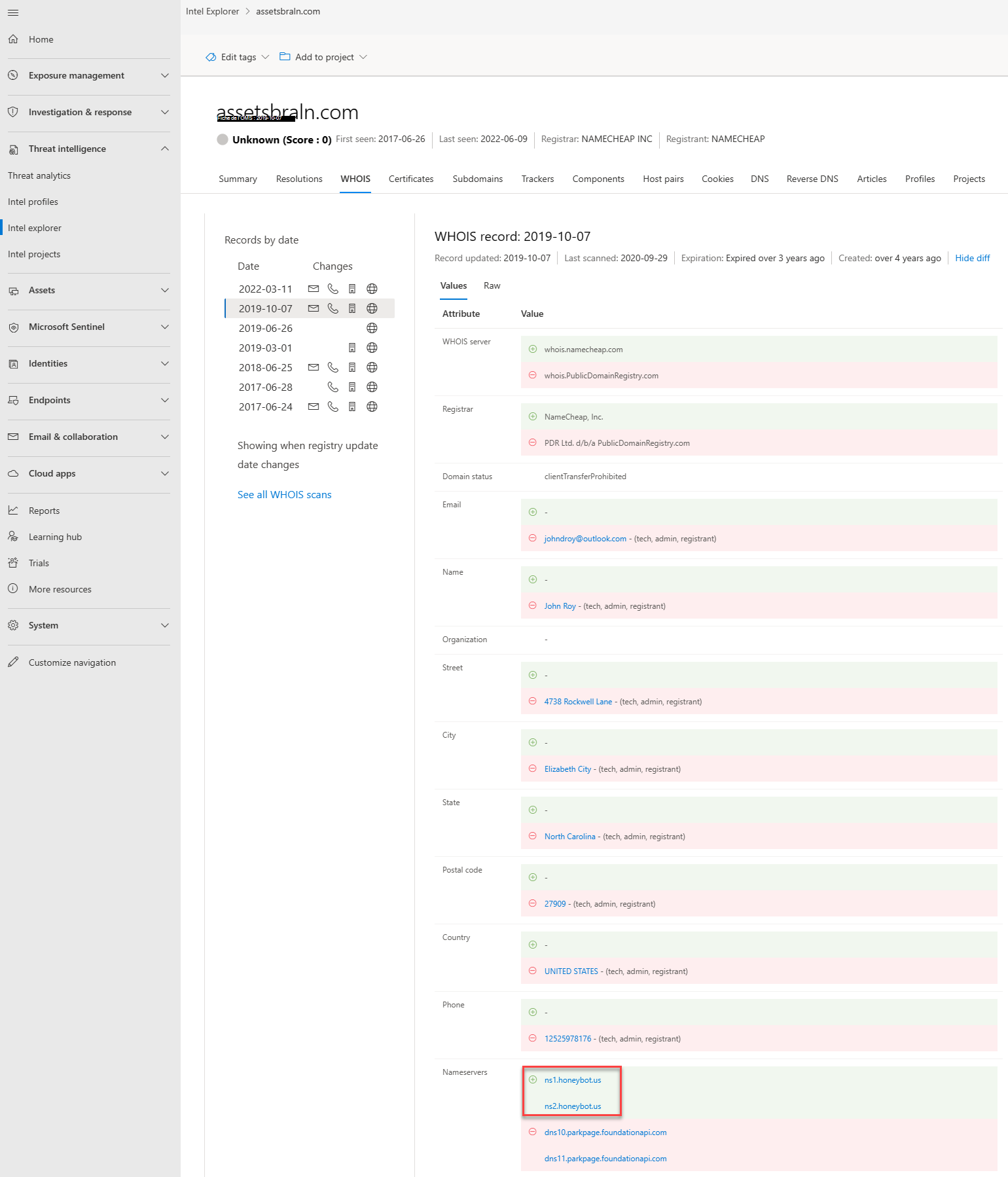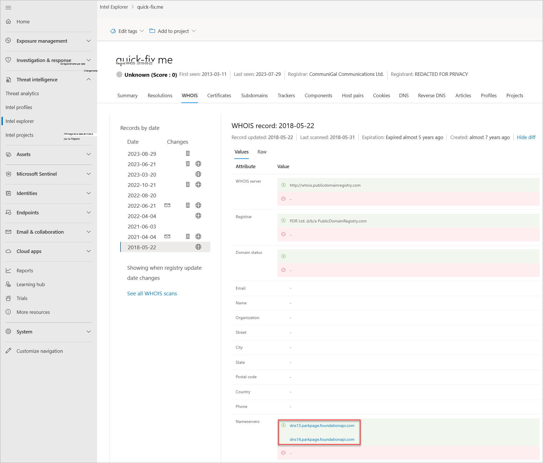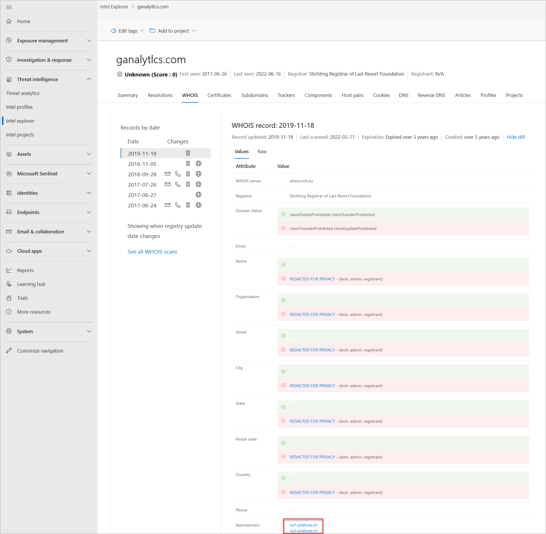 Des milliers de fois par jour, des domaines sont achetés et/ou transférés entre des individus et des organisations. Le processus est facile, ne prend que quelques minutes et peut être aussi bas que 7 $, selon le fournisseur du bureau d’enregistrement. Au-delà des détails de paiement, il faut fournir des informations supplémentaires sur eux-mêmes. Certaines de ces informations sont stockées dans le cadre d’un enregistrement WHOIS sur lequel le domaine a été configuré. Cette action serait considérée comme une inscription de domaine public. Toutefois, il existe des services d’enregistrement de domaine privés, où l’on peut masquer leurs informations personnelles dans l’enregistrement WHOIS de leur domaine. Dans ces situations, les informations du propriétaire du domaine sont sécurisées et remplacées par les informations de leur bureau d’enregistrement. Davantage de groupes d’acteurs effectuent des inscriptions de domaine privé pour rendre plus difficile pour les analystes de trouver d’autres domaines dont ils sont propriétaires. Defender TI fournit différents jeux de données pour rechercher l’infrastructure partagée des acteurs lorsque les enregistrements WHOIS ne fournissent pas de prospects.