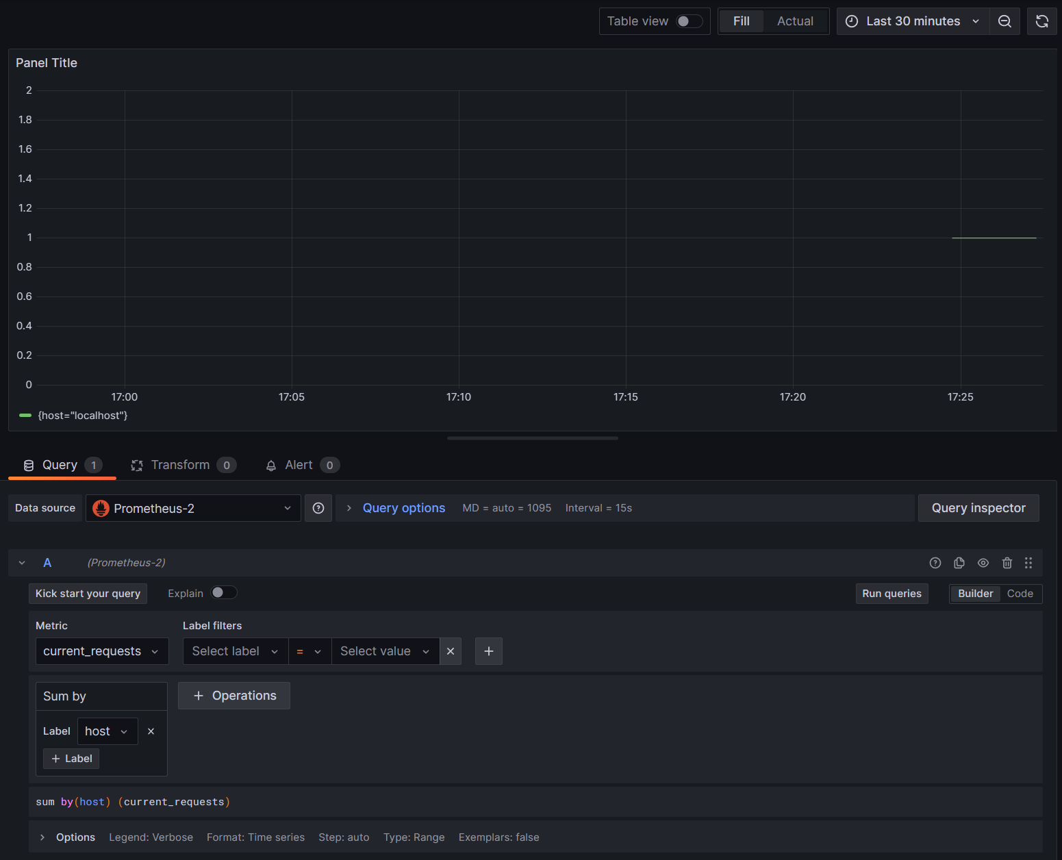 Les graphiques dans Grafana sont généralement partitionnés en fonction de chaque combinaison unique de dimensions. Les dimensions peuvent être utilisées dans les requêtes Grafana pour filtrer ou agréger les données. Par exemple, si vous représentez un graphique current_requests, vous verrez des valeurs partitionnée basées sur chaque combinaison de dimensions. Pour filtrer uniquement en fonction de l’hôte, ajoutez une opération de Sum et utilisez host en tant que valeur d’étiquette.