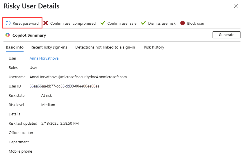 - Bloquez l’utilisateur si vous pensez que l’attaquant peut réinitialiser le mot de passe ou procéder à l’authentification multifacteur pour l’utilisateur.
