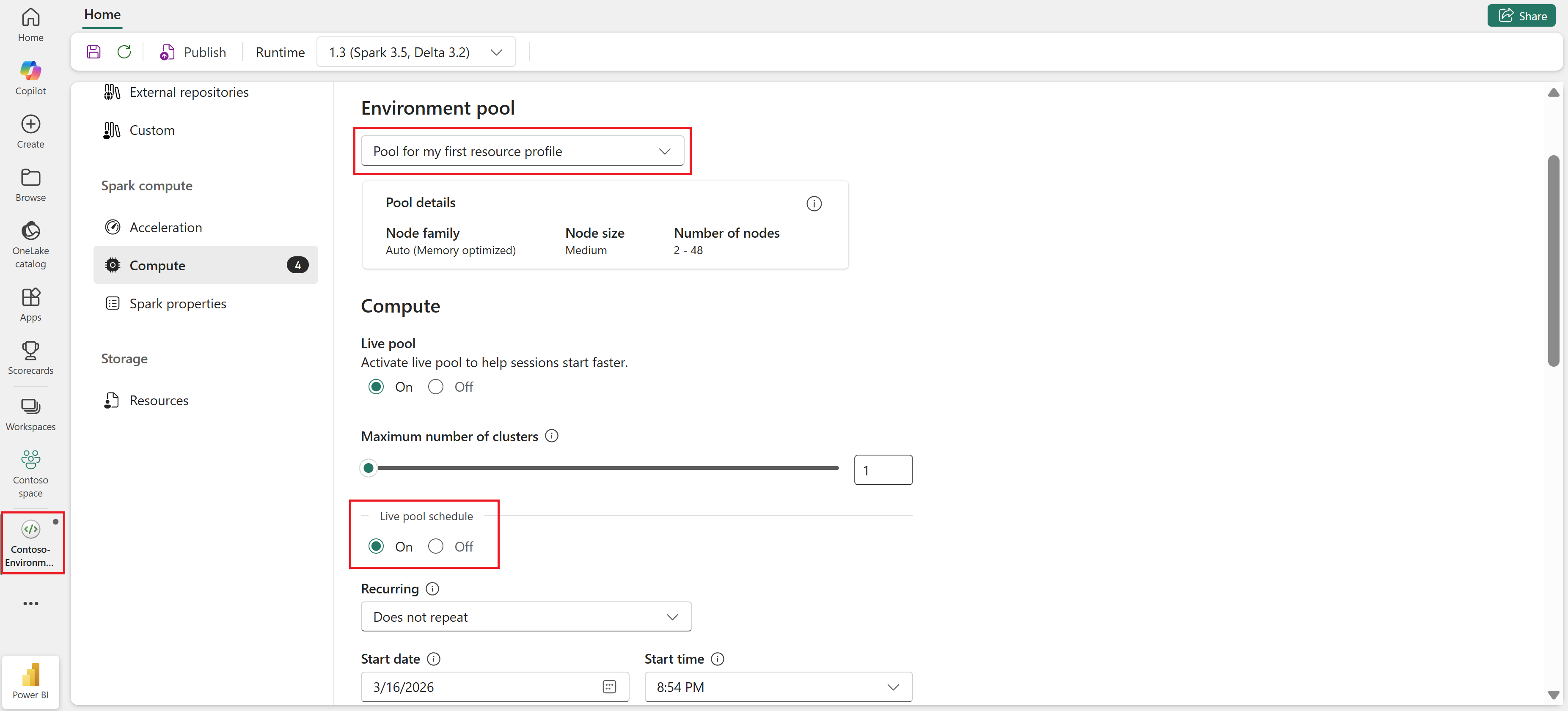 Après avoir créé un pool Spark personnalisé, activez le calcul du pool en direct via les paramètres d’environnement .