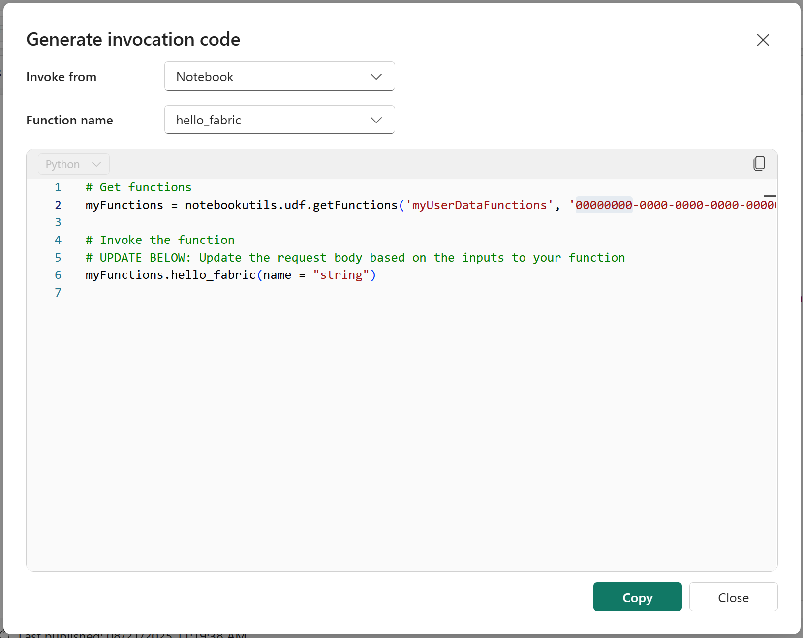 Une fois que vous avez publié vos fonctions de données utilisateur, vous pouvez les appeler à partir d’éléments Fabric ou d’applications externes. Au lieu d’écrire le code d’appel à partir de zéro, utilisez la fonctionnalité Générer un code d’appel pour créer automatiquement des modèles de code prêts à l’emploi.