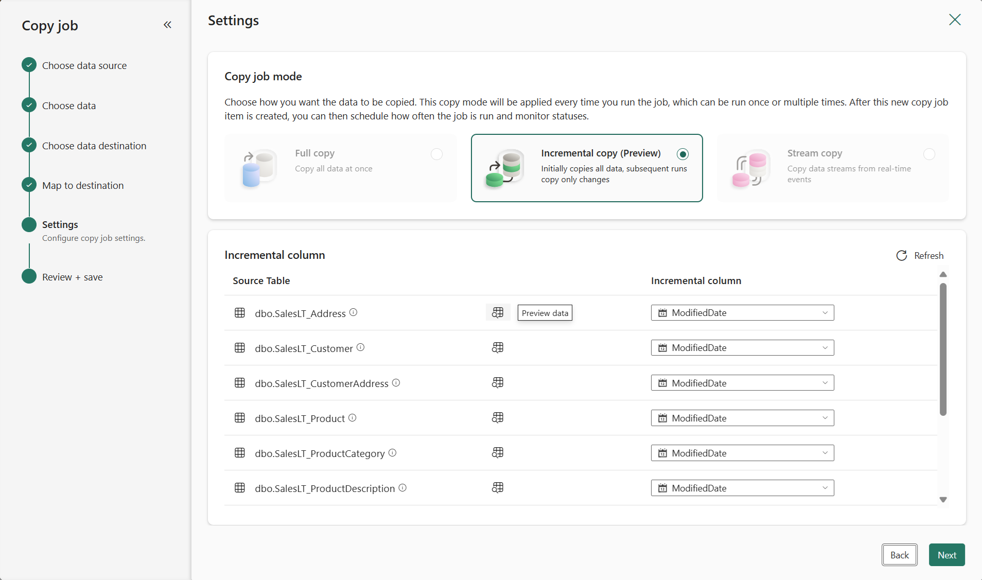 Choisissez un mode de copie : copie complète des données ou copie incrémentielle. Dans cet exemple, nous utilisons la copie incrémentielle. Choisissez une colonne incrémentielle pour chaque table pour suivre les lignes qui ont changé. Vous pouvez utiliser le bouton d’aperçu pour rechercher la colonne droite.